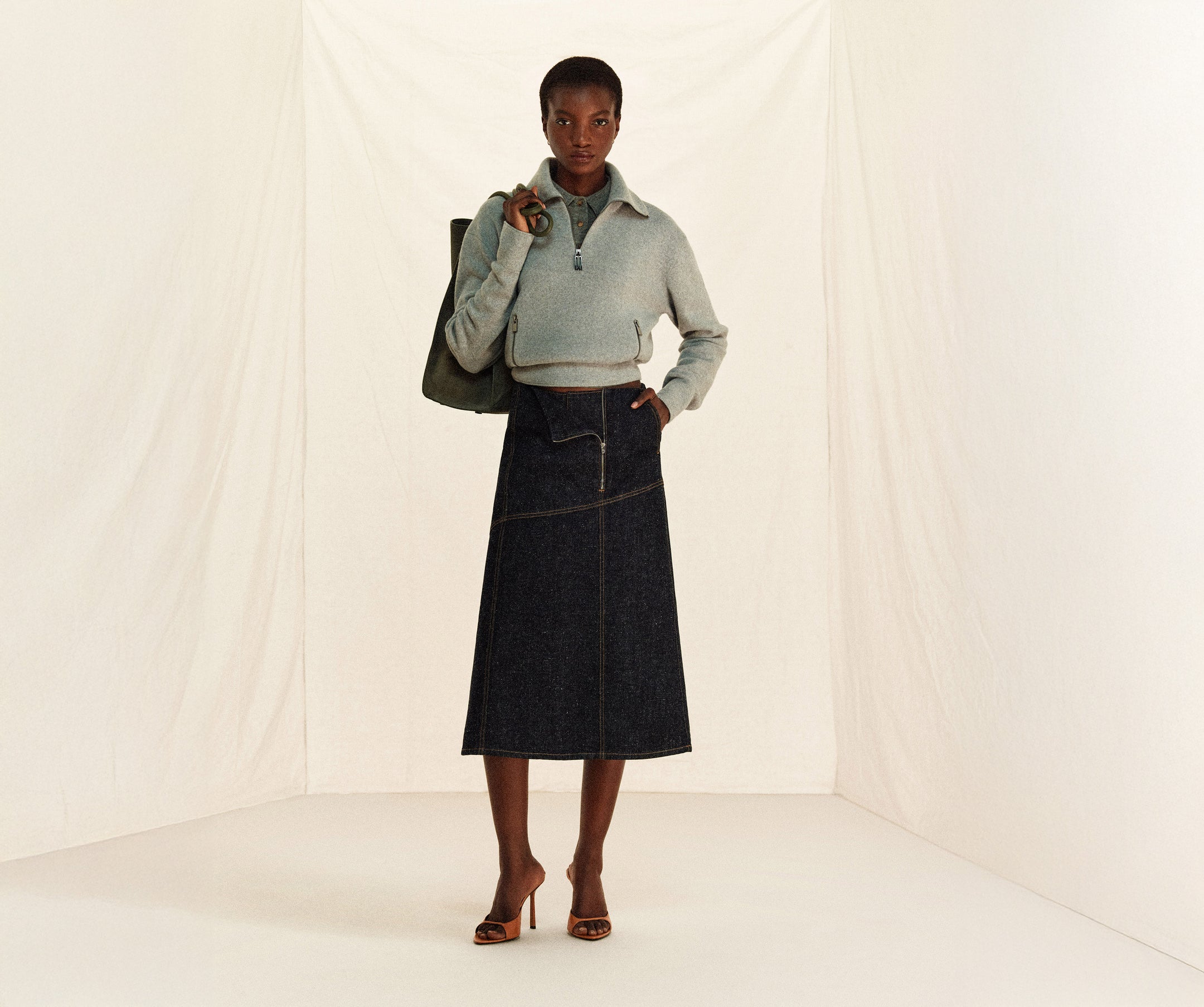 • A woman stands against a white background wearing a light beige lambswool sweater and black trousers with a gold buckle belt featuring the Victoria Beckham monogram.