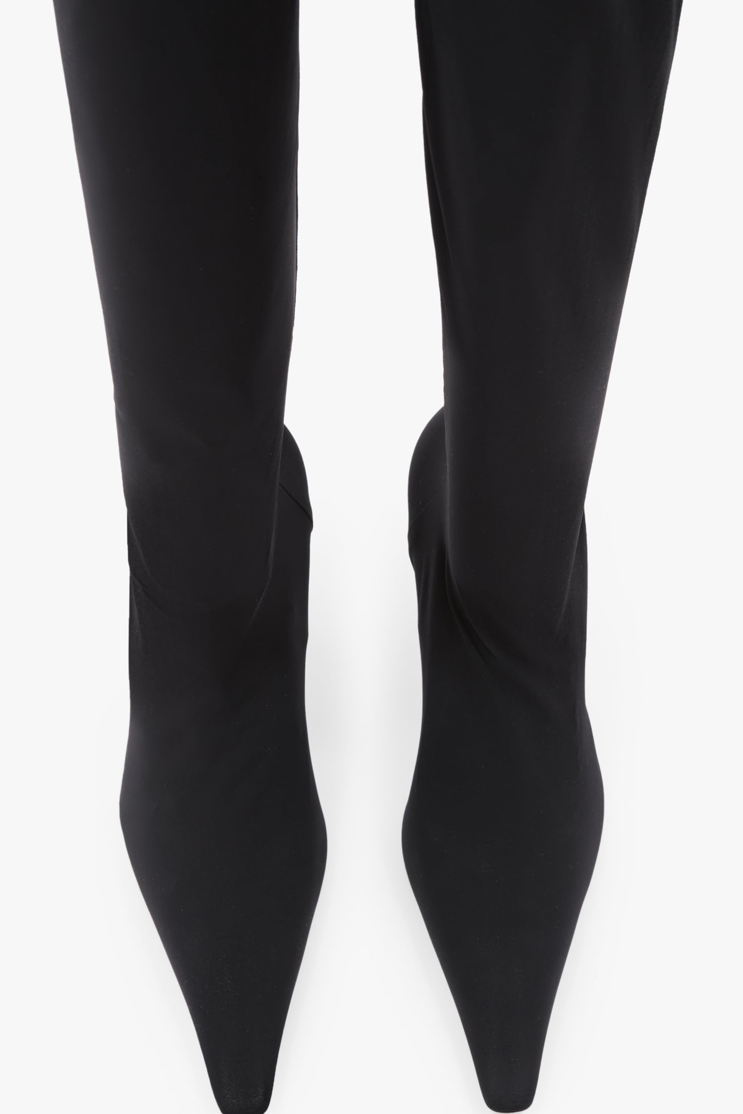Crafted from a flattering stretch jersey, the Sloan Stiletto Jersey Boot in Black has a sleek and sexy silhouette by virtue of a pinched, closed-toe shape, 100mm heel and thigh-high leg. The heel is coated in black lacquer for a textural contrast, while tactile leather lining adds a premium finishing touch. A padded insock ensures absolute comfort.