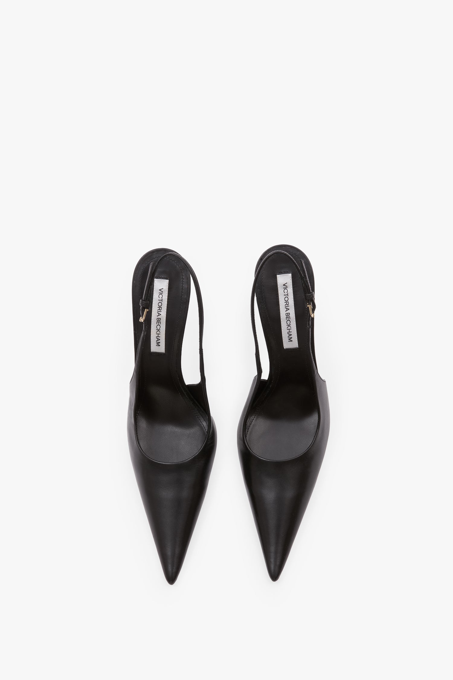 A refined slip-on shoe, the Victoria Stiletto Slingback is crafted from smooth black kid leather with a contrasting black lacquered 100ml heel for textural interest. It has a pointed silhouette with closed toe, leather lining and a padded in-sock for added comfort.