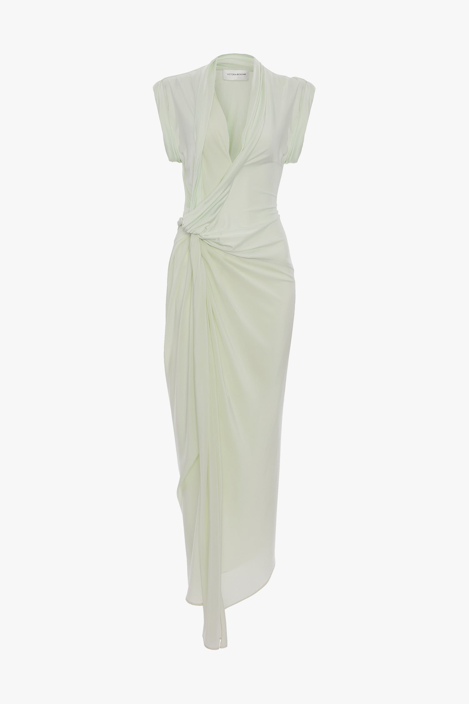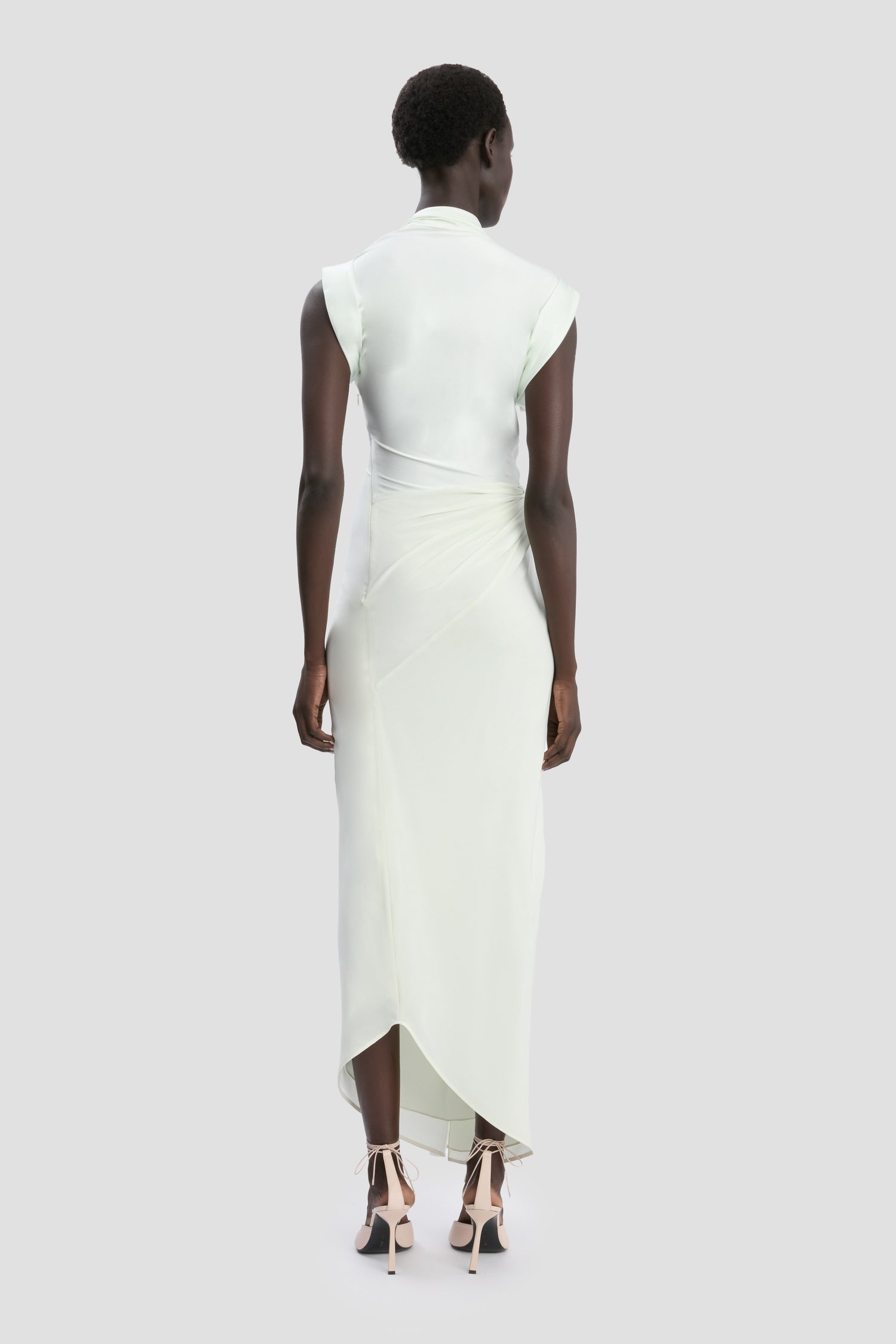 Contrasting textures on the bodice and skirt bring a tactile point of difference to the Twist Dress. Presented in an exclusive shade of Aloe, it has a wrap-front neckline with button closure, front skirt split and directional asymmetric hemline. Elevated design details include a short sleeve with rolled hemline and twisted drape neckline.