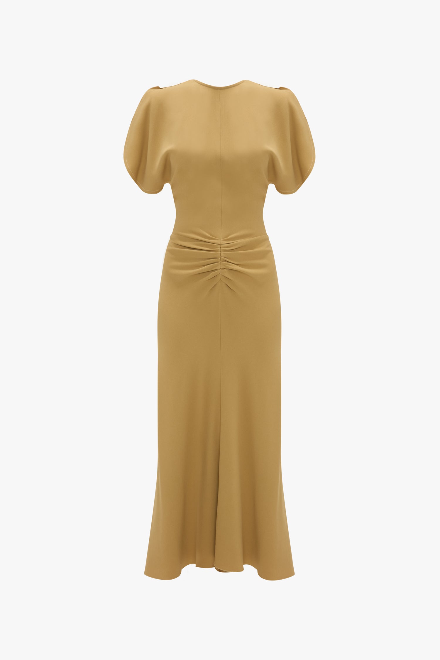 Presented in a warm shade of Honey, the Gathered Waist Midi Dress is a house favourite, delivering a professional and polished aesthetic. A waist and hip-hugging cut offers a flattering and forgiving silhouette, while a pleated detail at the waist and V-shape waist seam at the back add sensuous talking points. Finished with a contrasting topstitch and a longer-length hem at the back, it is a wear-anywhere piece.