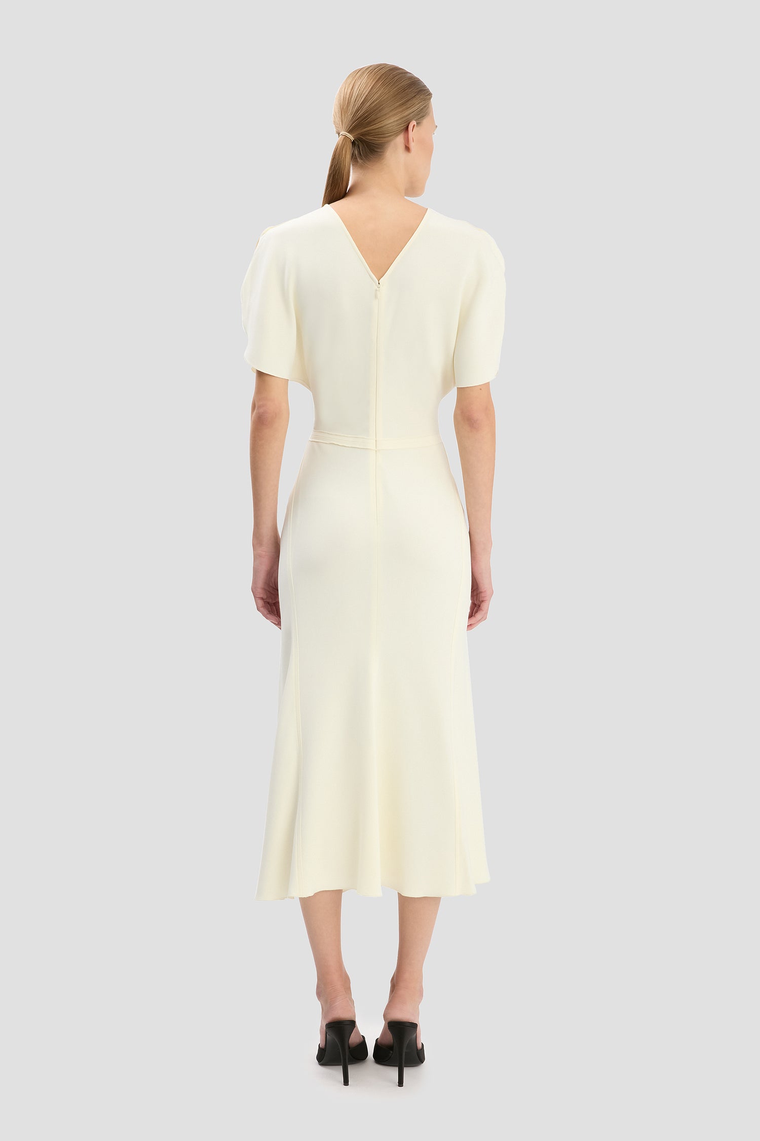 Crafted from a fluid cady fabric, the Bela Midi Dress in Ivory has an effortless drape with tactile pleating at the waist. A V-shape neckline at the back adds a discreet but directional design detail, while the round front neckline and midi-length hemline look polished and professional.