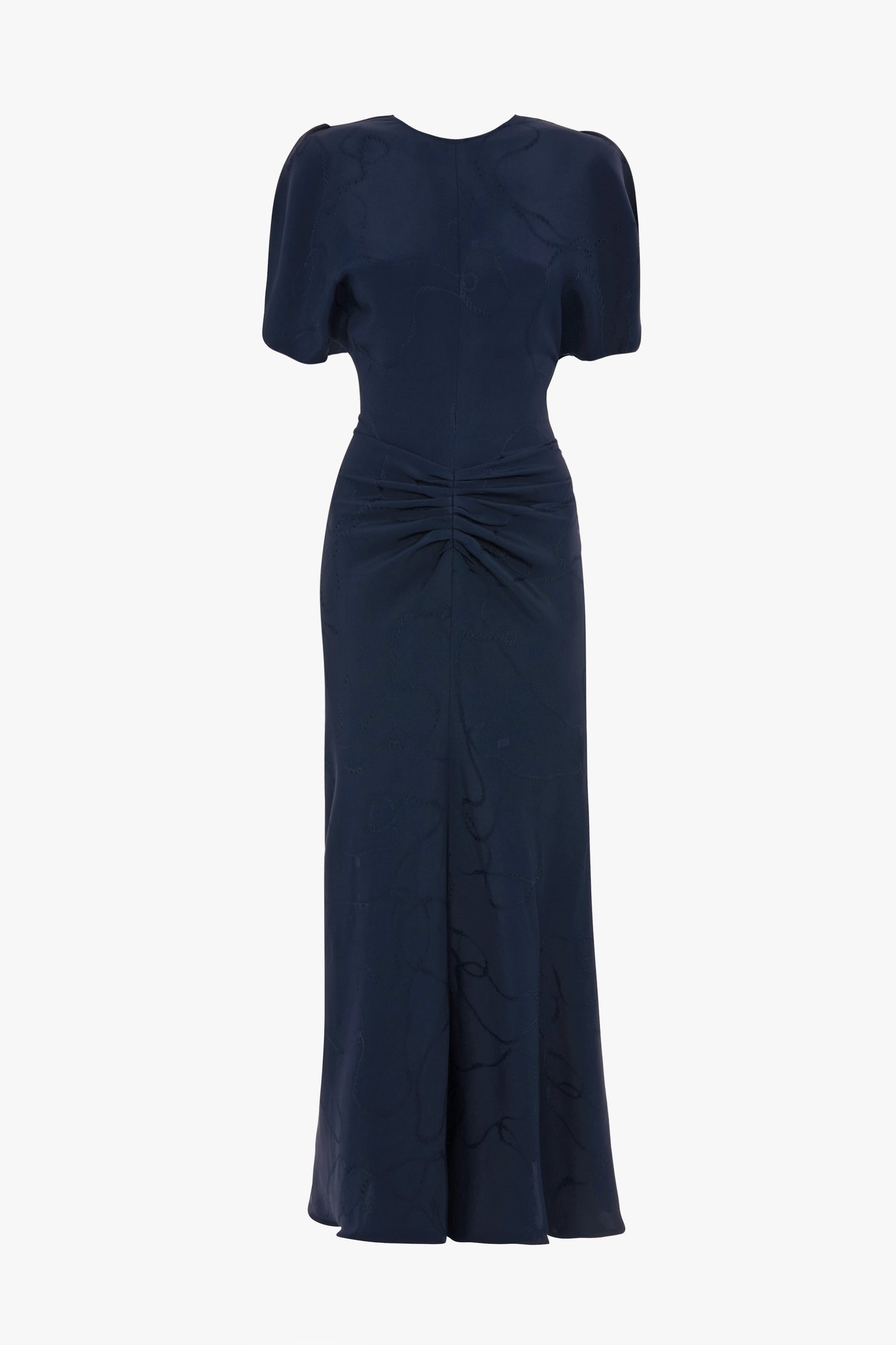 Crafted from a distinctive pearl jacquard, the Bela Midi Dress in Navy has a modest front round neckline and an unexpected V-neck at the back. Pretty short sleeves and a tactile gathered detail at the front complete the look.