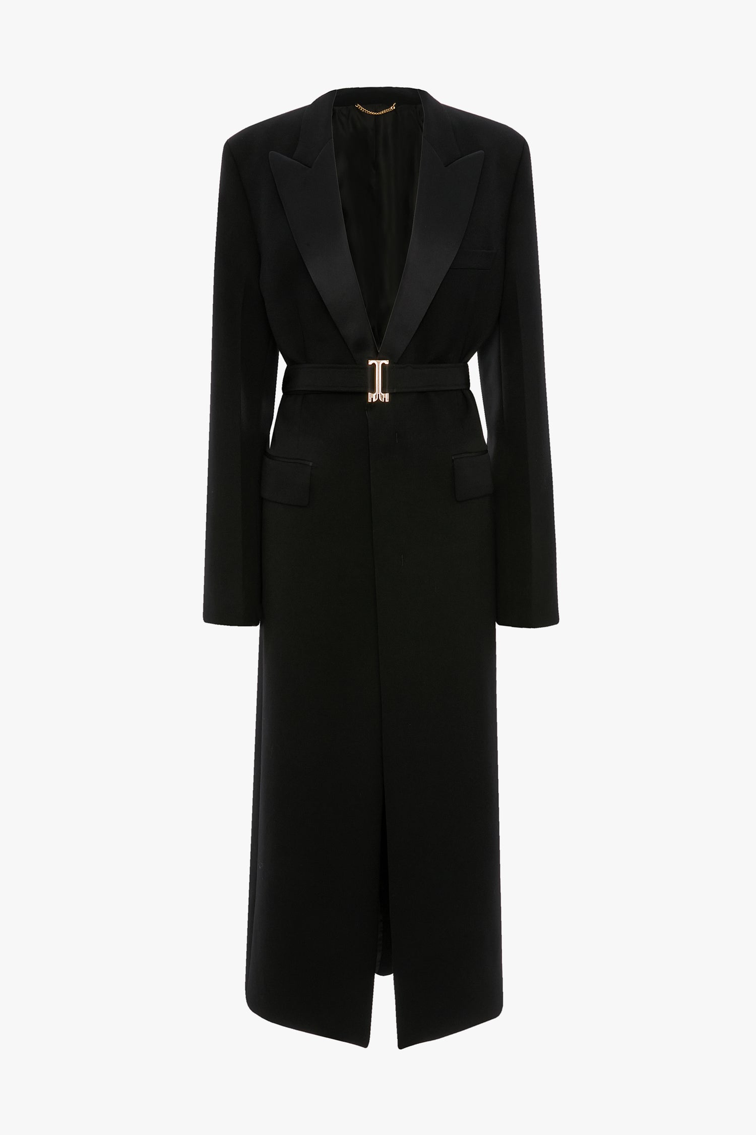 The grain de poudre fabrication and longline silhouette bring a sumptuousness to the Belted Tailored Coat. Elevated with contrasting satin lapels, waist belt and belt loops, it is a practical and polished piece of outerwear. A centre back vent and concealed front button closures complete the look.