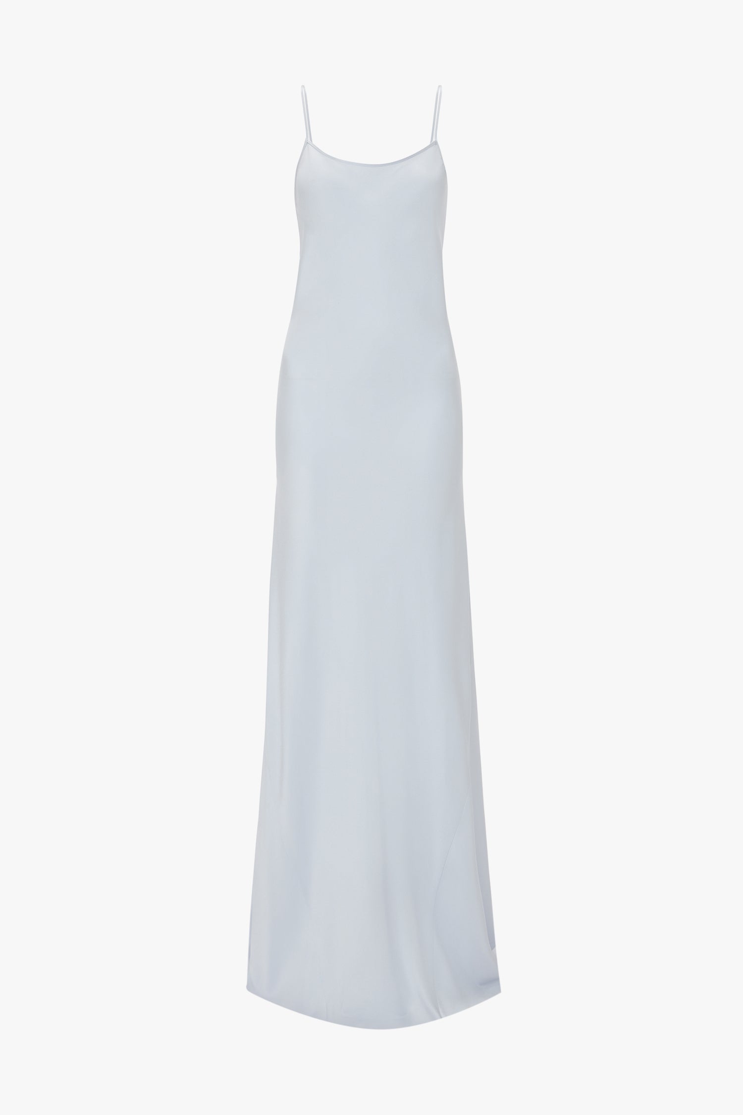 Referencing Victoria’s favourite style decade, this 1990s-inspired camisole-slip dress is crafted from fluid crepe back satin for a sensual lightweight feel. Cut on the bias for a figure-flattering drape, it has a scooped deep-V at the back with horizontal strap for a provocative point of interest and a godet insert and mini train. Presented in a subdued shade of Ice, it deftly reimagines nineties retro glamour.