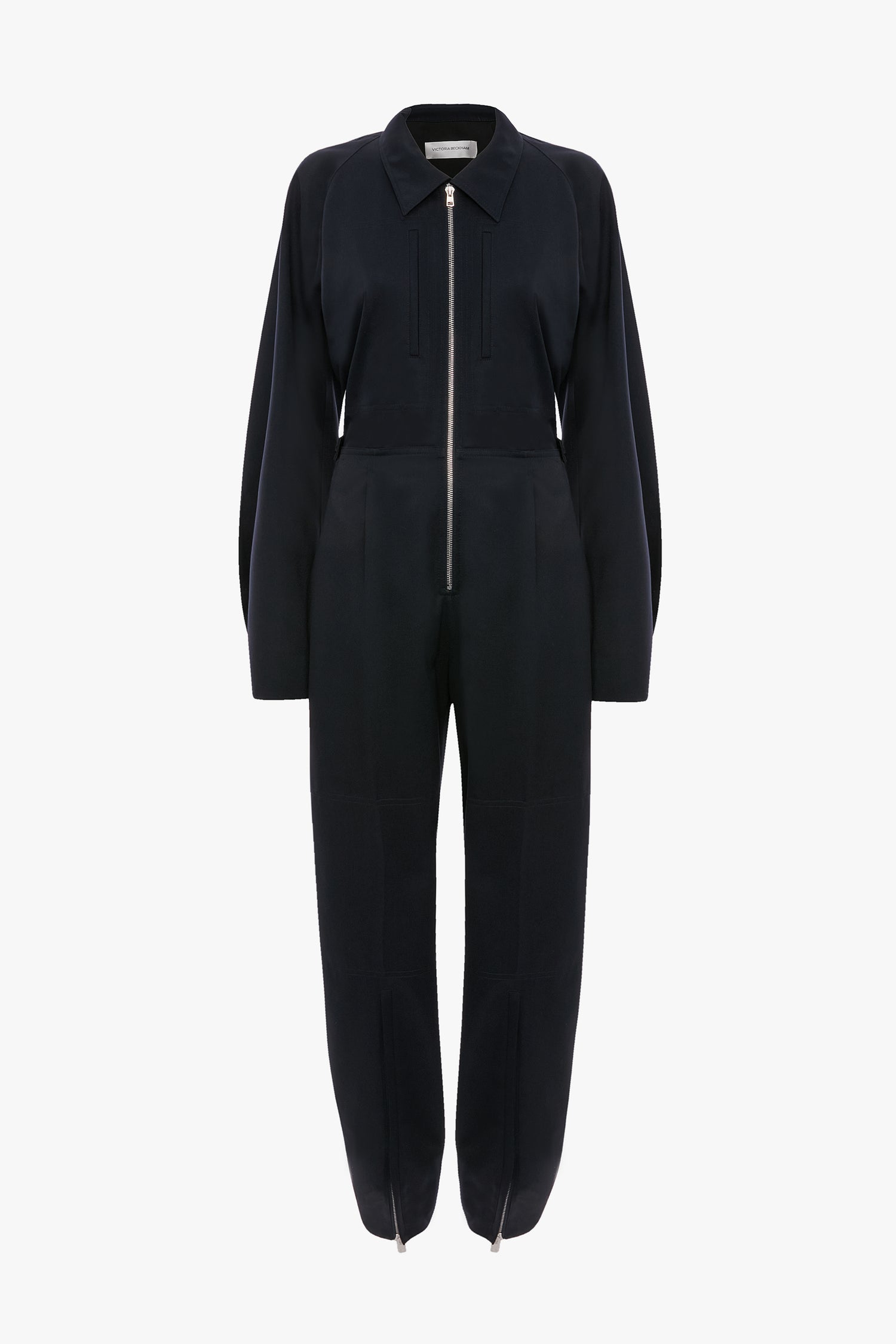 Classic utilitarian design codes are mixed with contemporary design details for an elevated take on traditional workwear. Crafted from a wool blend, the Cargo Jumpsuit in Navy features an exposed front zip in silver, leg cuff zips and knee patches with tonal topstitching. An elasticated waistband creates a figure-flattering silhouette.