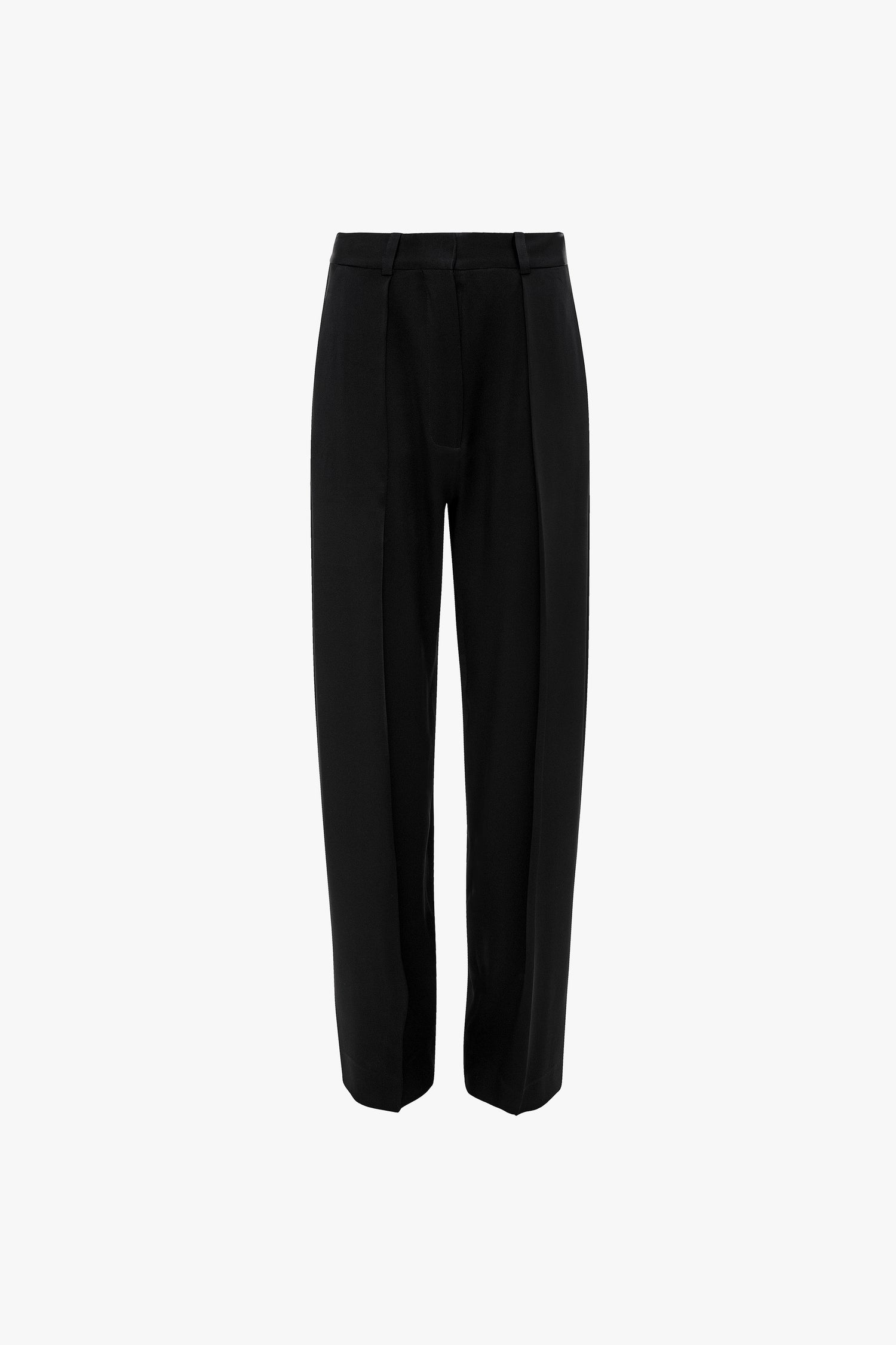 Meticulously tailored from crepe back satin, the Charlee Trouser in classic Black offers a distinctly feminine perspective on traditional menswear tailoring. With a high-rise waist, wide leg and structured pleats along the trouser legs, it has an effortlessly elegant silhouette. Side seam pockets, back jet pockets and belt loops have a streamlined effect, while flat piping on the outside legs add an attractive point of difference.