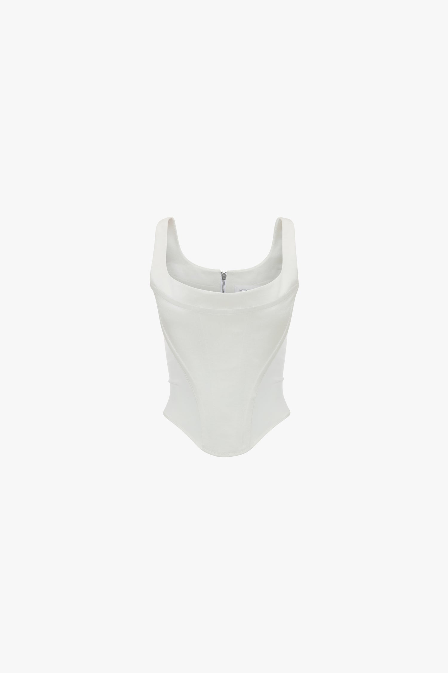 Designed to create a feminine hourglass silhouette, the Side Panel Corset Top in Ivory is crafted from crepe back satin and is fully lined. Boning on the front and back body panels create a sexy corset effect, while the V-shaped waistline adds an elevated point of difference. Matte crepe back satin side body panels create a textural contrast, while an exposed metal zip at the back adds a contemporary finishing touch.