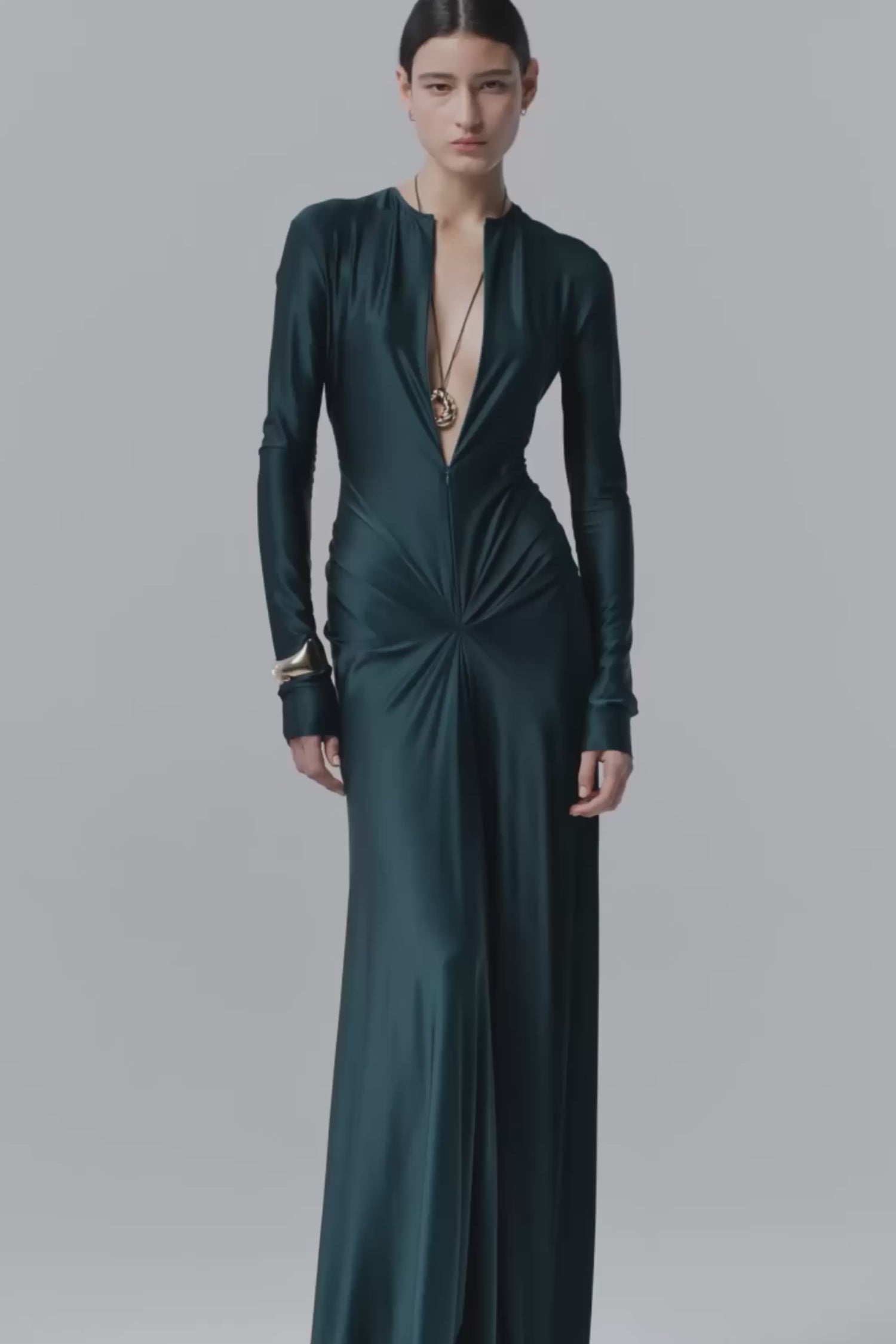 Demure but dramatic, the Cut-Out Gown in Dark Teal has modest long sleeves, a round neckline and a floor-pooling hemline. Distinguished by tactile ruching at the cuff, a pleated finish on the skirt and a twist detail with cut-outs on the back bodice, it blends elegance and allure beautifully.