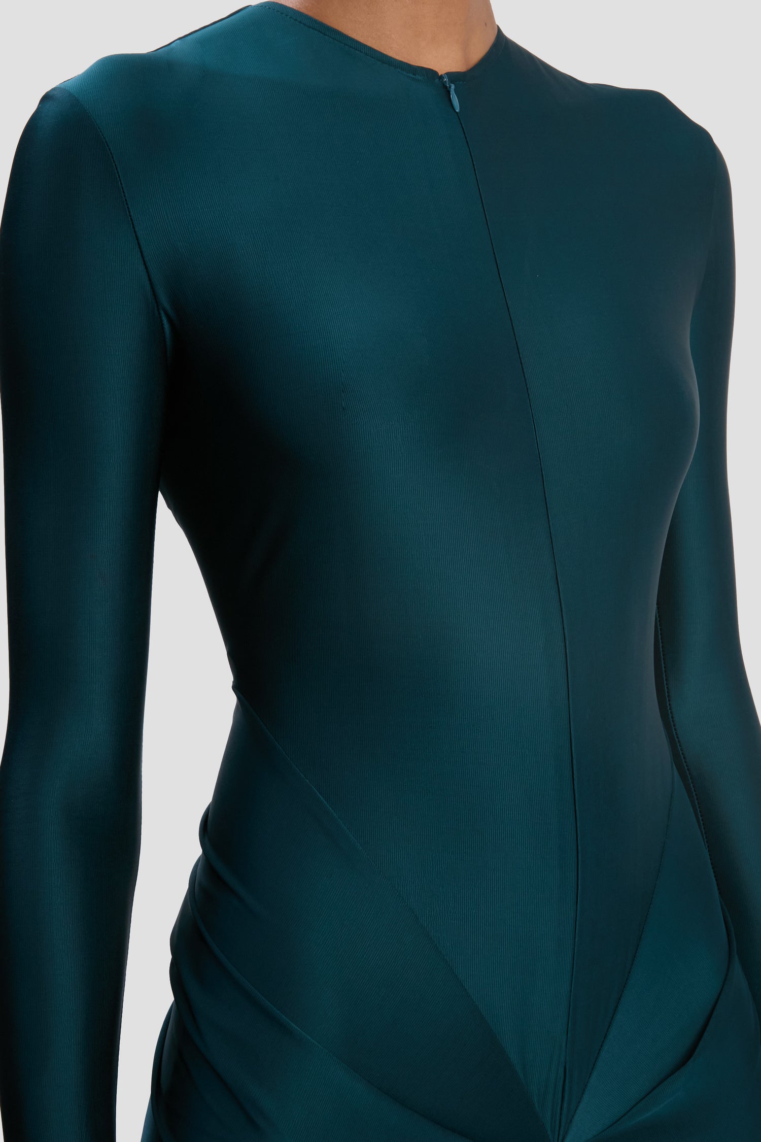Crafted from a high-shine stretch jersey, the Cut-Out Gown in Dark Teal marries sophistication and provocation. Defined by a round neckline, extra-long sleeves and floor-pooling hemline, its modest silhouette is punctuated by a tactile twisted detail with cut-outs at the back bodice, while a front zip fastening allows for a customizable neckline fit.