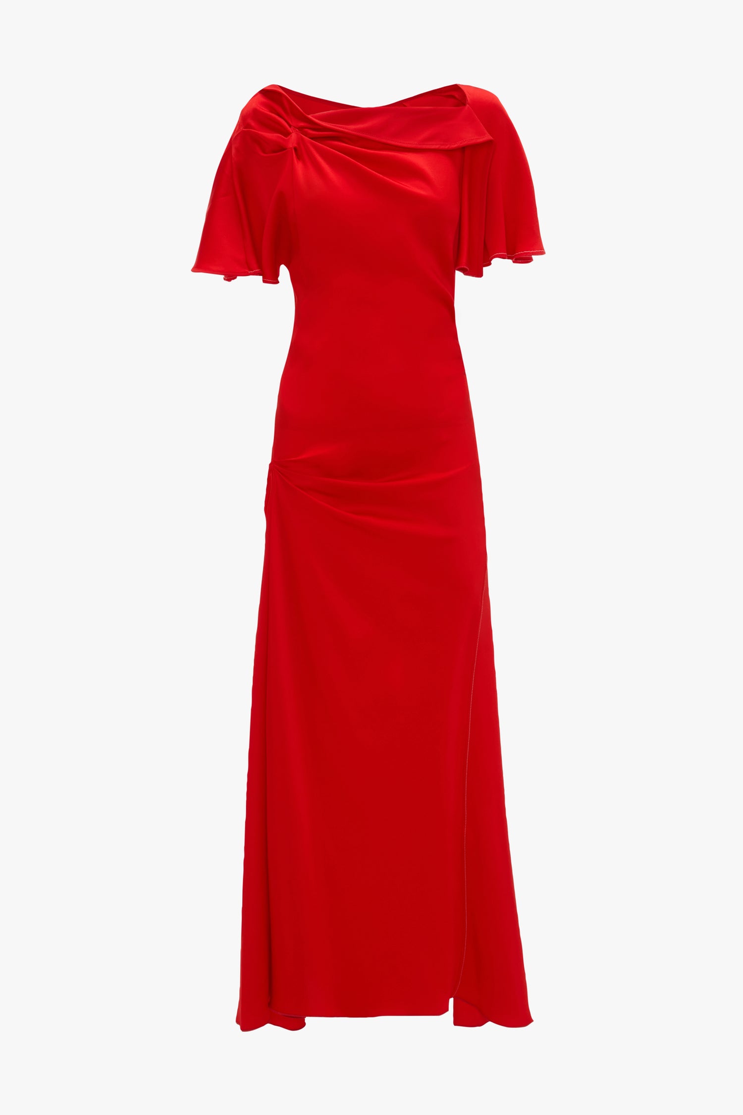 The crepe back satin fabrication and distinctive draping at the neckline and sleeves bring a tactile quality to this refined midi dress. Fitted at the bodice, waist and hem, with a fluid skirt, it has a feminine sensibility enhanced by a pleat detail at the shoulder and skirt. Cord piping at the neckline adds a contemporary talking point, while a directional asymmetric hemline completes the look. Presented in eye-catching Cayenne, it brings a fresh perspective to the house’s midi dress archive.