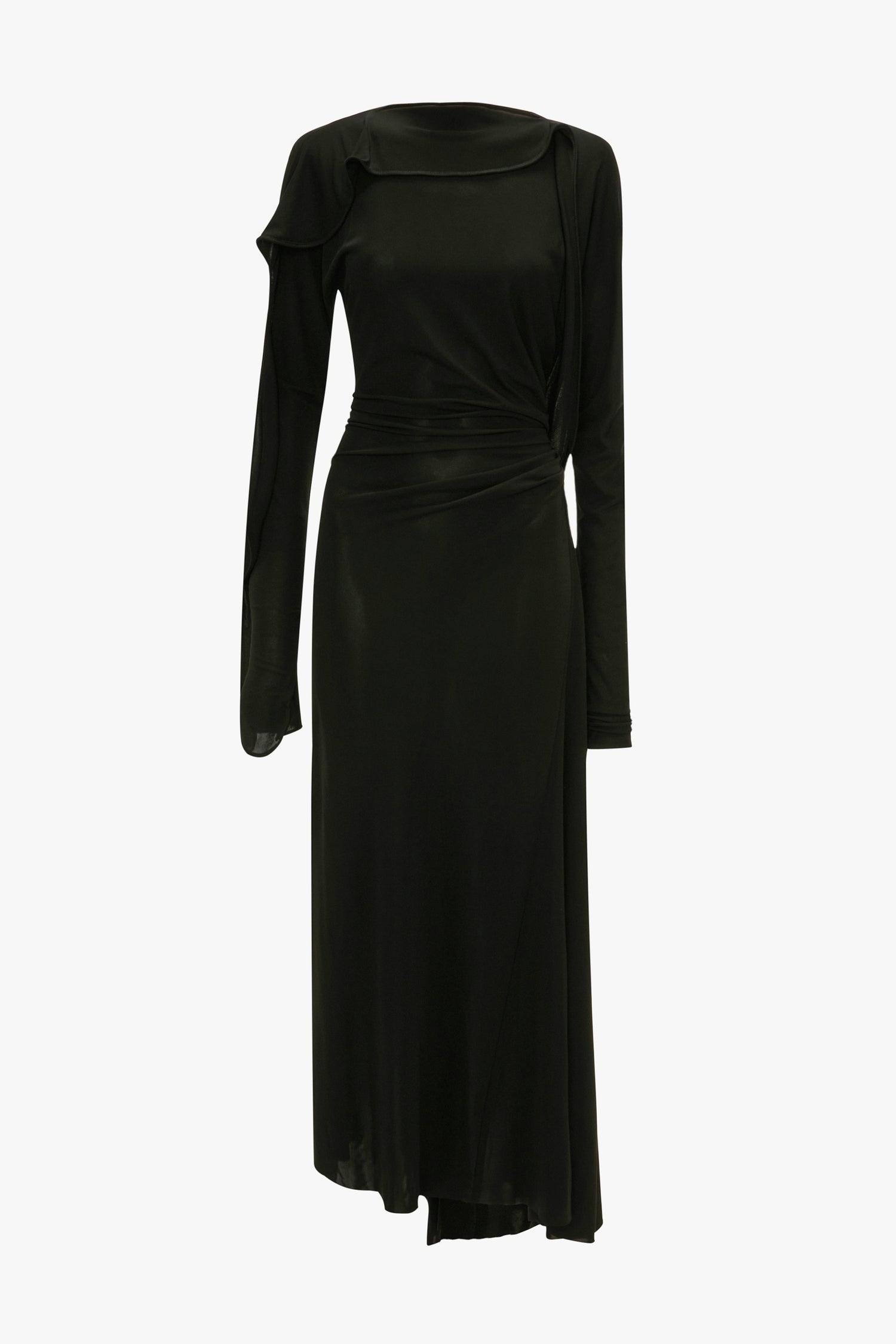 Discreet but directional talking points elevate the Long Sleeve Draped Jersey Midi Dress from a traditional LBD to a contemporary classic. Distinguished by its draped neckline with cord piping, it also features elegant draping at the sleeves and back skirt. The waistline is defined by tactile pleats, while an asymmetric hemline and sleeves add modern flair.