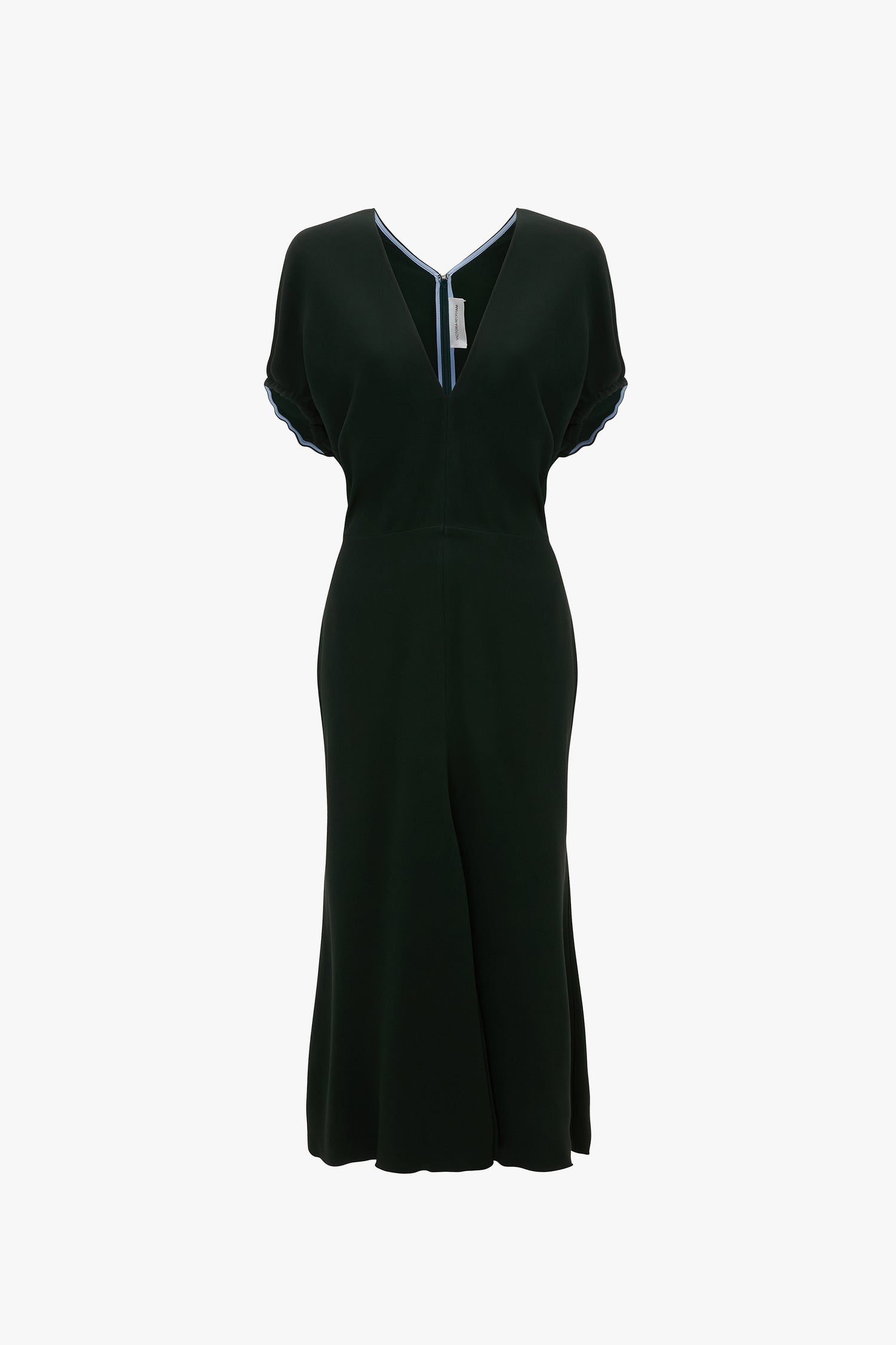 Effortlessly elegant midi dresses are a hallmark of the Victoria Beckham brand. The Edith Midi Dress in sumptuous Dark Pine is characterised by short full sleeves with directional rope edging. A front V neckline with internal binding adds a subtle talking point, while a longer-length hemline at the back adds fluidity to the silhouette. A fitted waist ensures a figure-flattering finish.