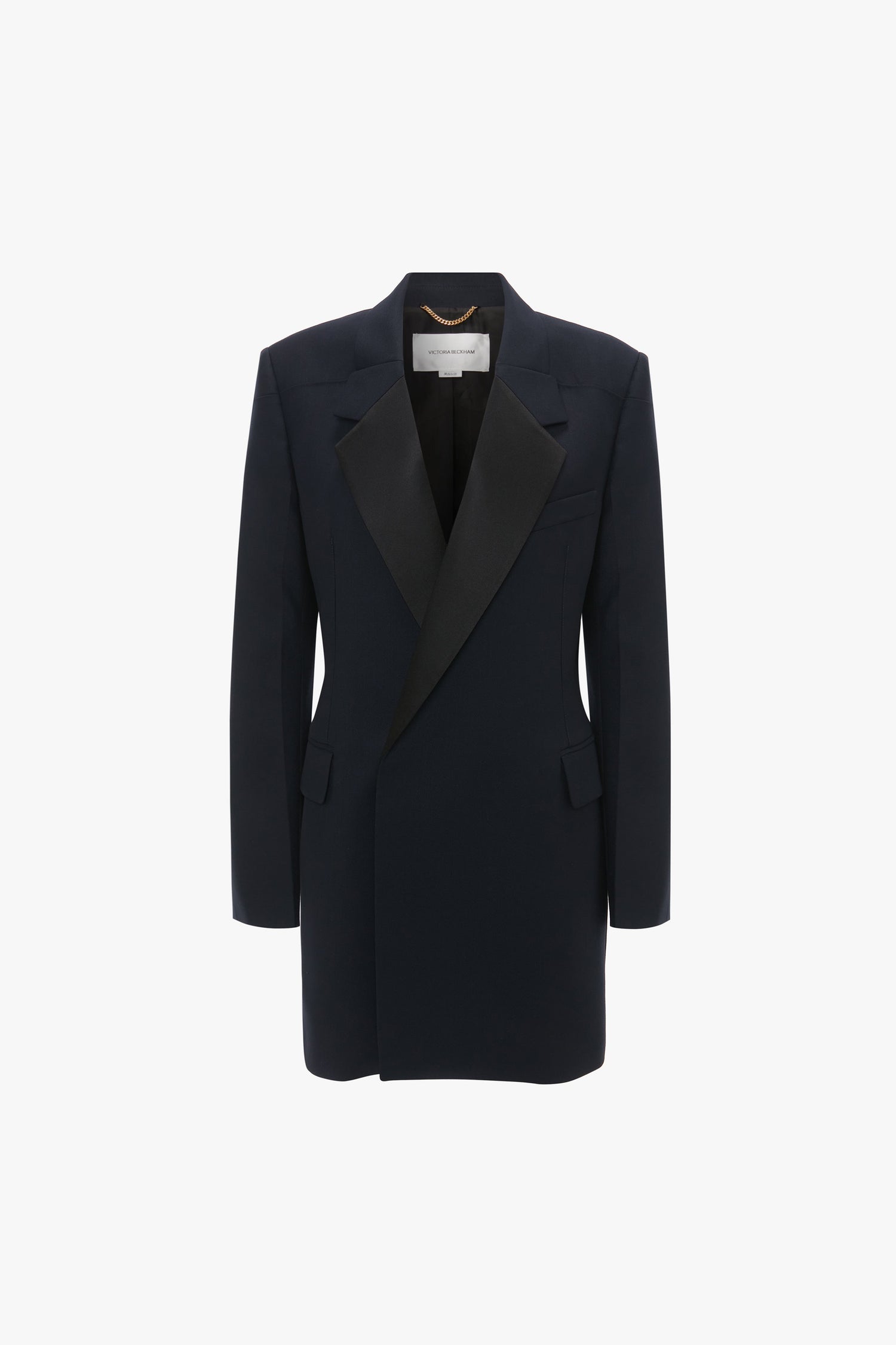 Masculine-inspired tailoring is a hallmark of the Victoria Beckham brand and the Fold Shoulder Detail Dress takes the traditional suit jacket and reimagines it as contemporary evening wear. Presented exclusively in refined Navy for the new season, it has a double-breasted cut for a gently defined waist and an otherwise relaxed fit. Elevated design details include an exposed seam detail across the front and back upper, satin lapels and front flap pockets.