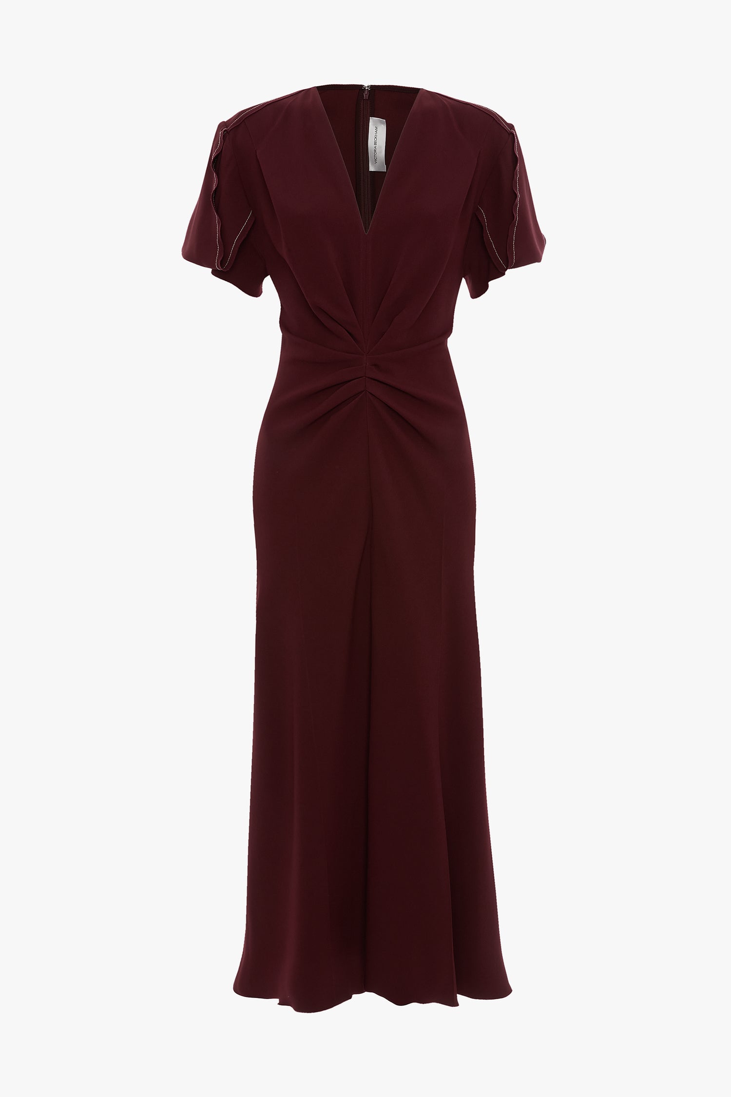 Classic design codes are revised and energised in the Eve Midi Dress in Cinnabar Red. Defined by its short sleeves with draped inserts, it has a V neckline, pleated detail at the waist and shoulder and a longer-length hemline at the back. Exposed seams and a contrasting topstitch add tactile finishing touches.