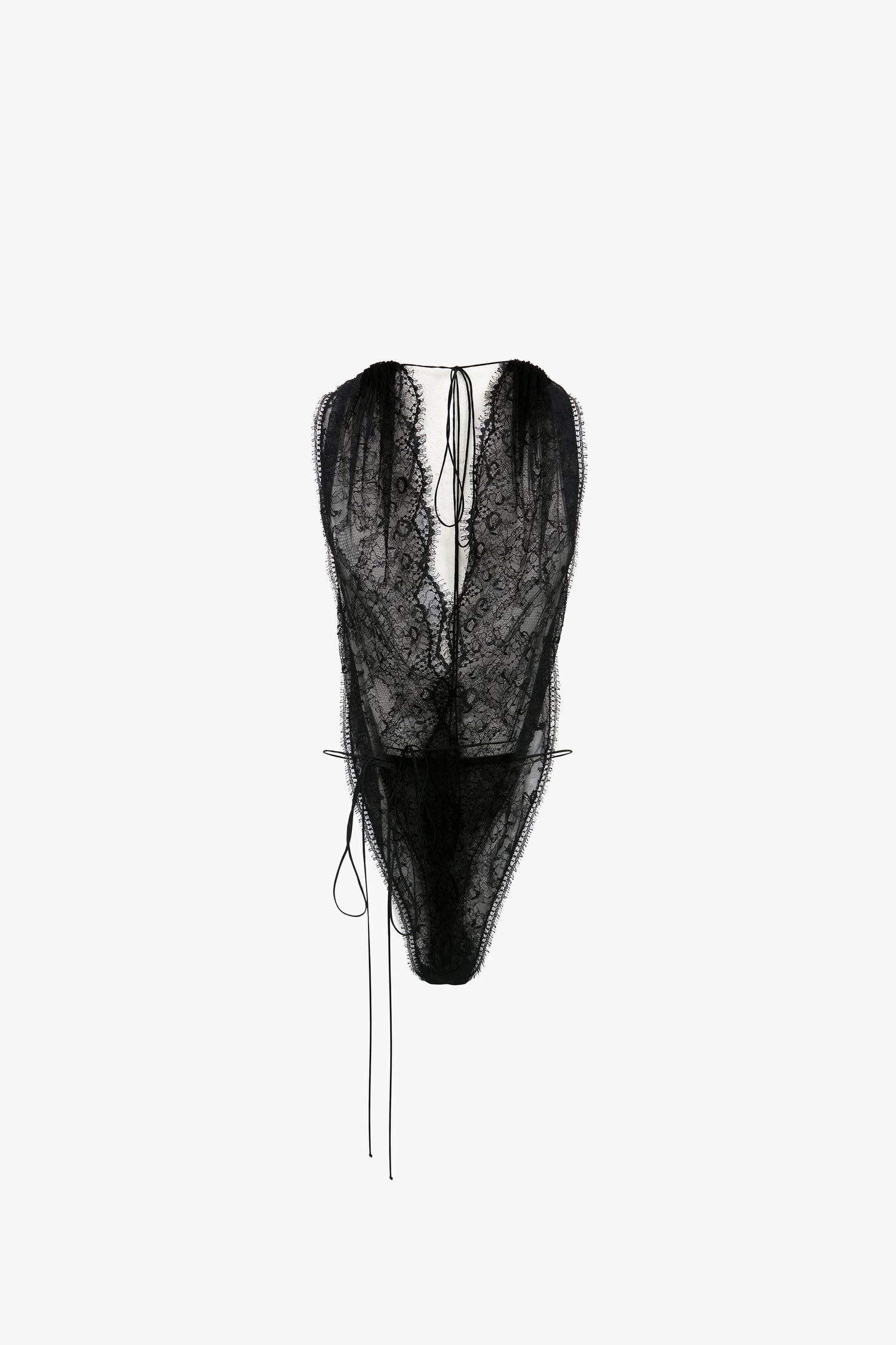 Sophisticated and sexy, the Halter Neck Lace Bodysuit in Black is delicately crafted from chantilly lace with scalloped detailing. Fully lined in a sheer plain tulle with a slight stretch, it has ties at the waist and back neck for added comfort. Decorative features include a gathered detail from the shoulder point through the front body and a light gathering across the back pant.