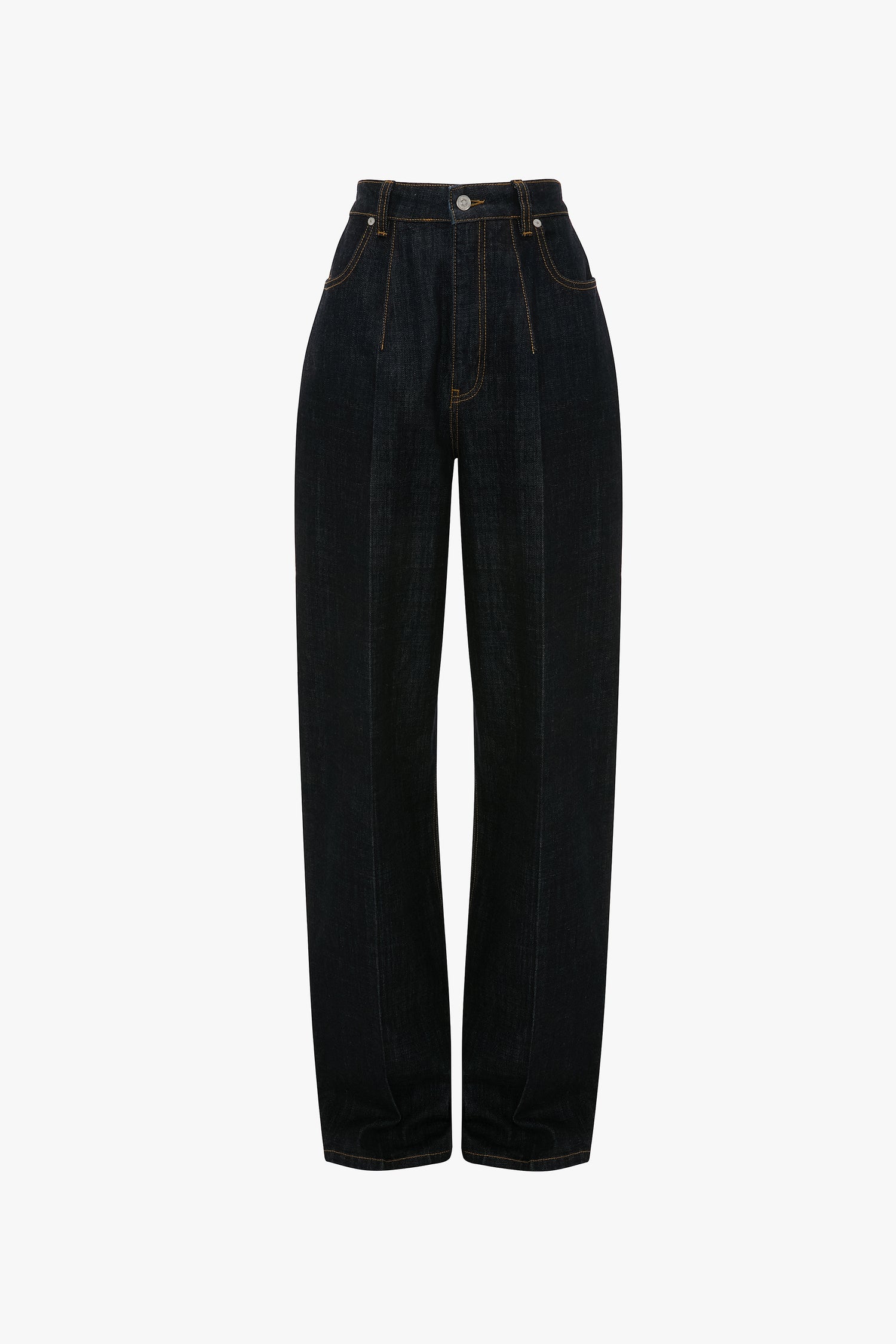 High-waisted with a wide, straight leg and crafted from 100% cotton, the High Waist Cinched Jean brings the house’s signature polish to utilitarian denim. Defined by dart details at the waistline and creases through the legs for a structured silhouette, the Cinched Jean is presented in an Indigo Rinse for added refinement. A branded leather patch on the waistband and tobacco topstitching complete the look.