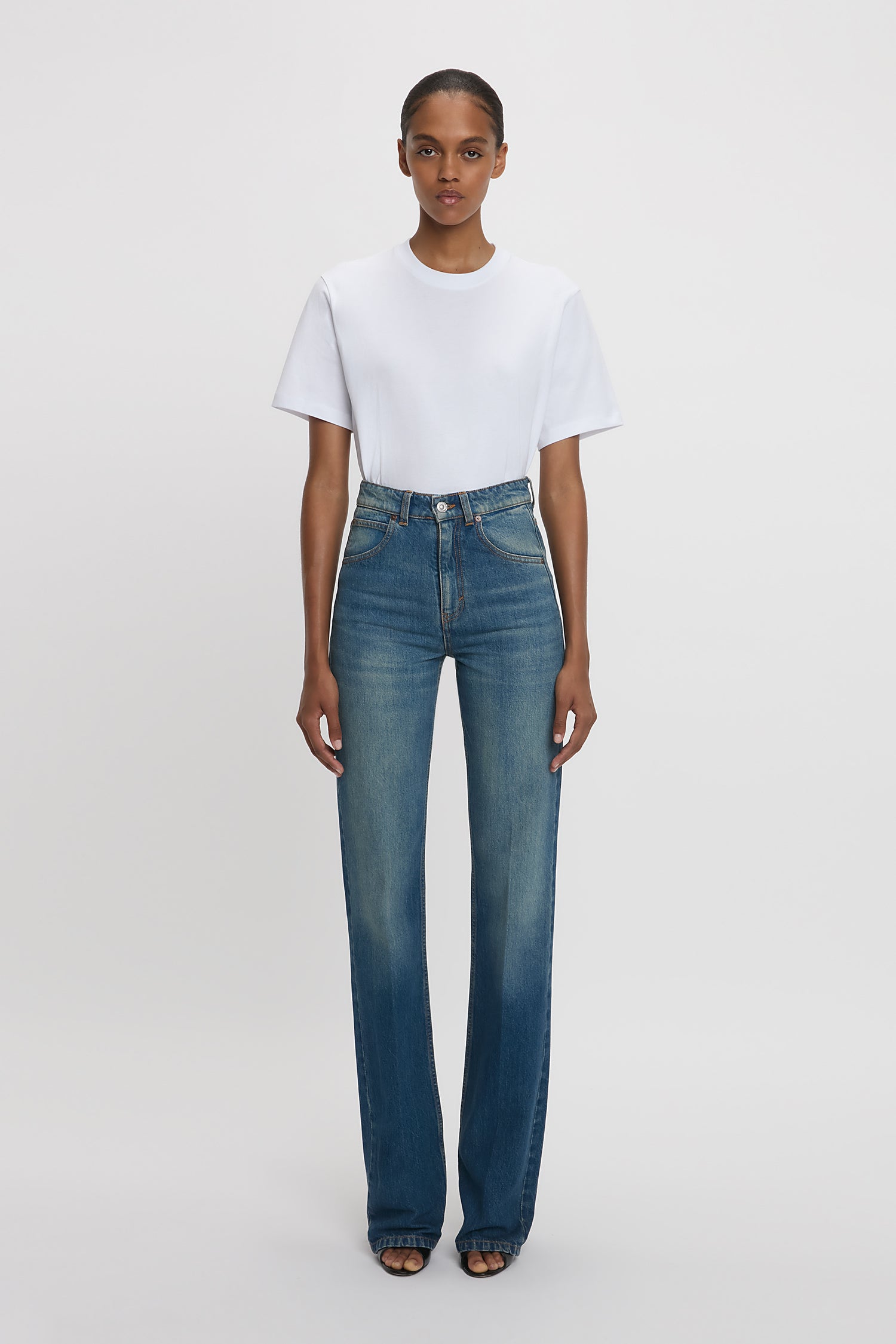 The Julia Jean is a house favourite, popular for its relaxed fit and laid-back look. Crafted from soft denim, it has a figure-flattering high waistline and an elongating straight leg. Presented exclusively in a versatile Mid Blue wash, it has discrete design details including a silver branded denim shank button and copper branded rivets, tobacco topstitching and a branded leather patch at the back of the waist.