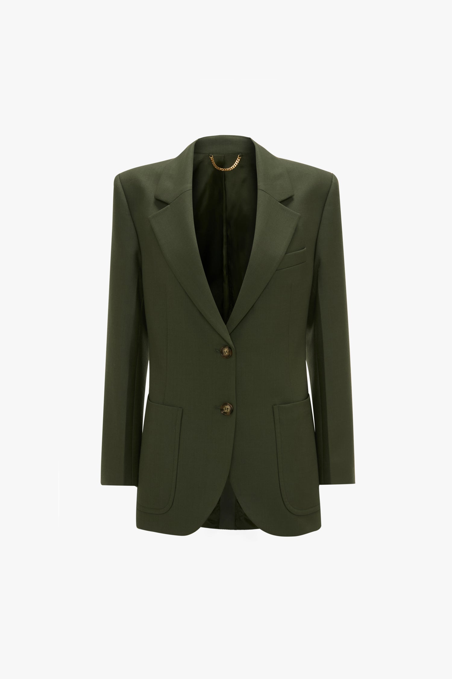A signature style in the house’s tailoring archive, the Katherine Jacket is single breasted with a lean, contemporary cut and shoulder pads for a poised silhouette. Distinctive patch pockets add seventies-inspired sophistication, while this season’s shade of Oregano brings a fresh and modern appeal. A two-button fastening, internal chest pocket and chain detail at the back of the neck complete the look.