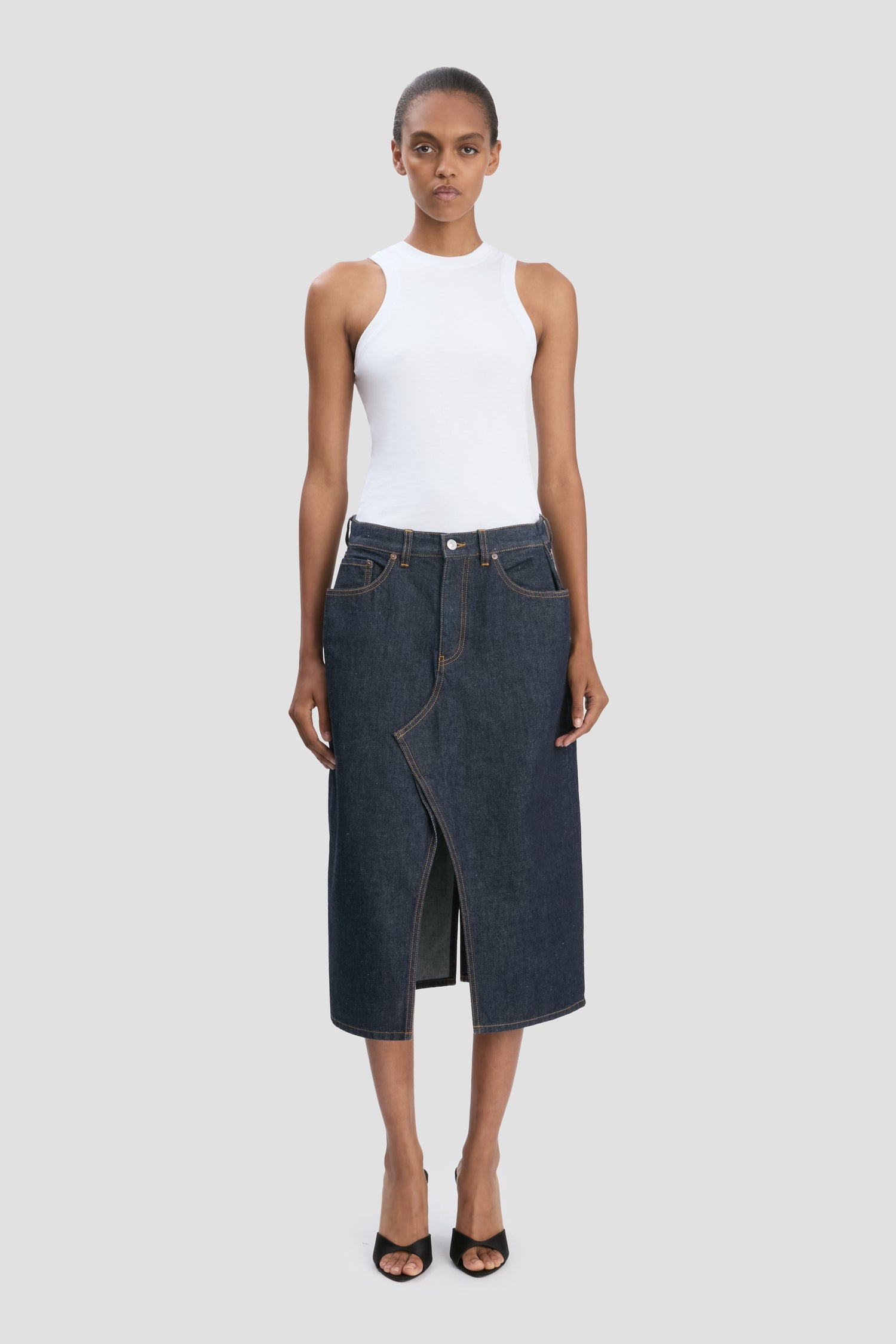 Blending feminine and utilitarian references, the Kick Pocket Denim Skirt has a contemporary sophistication. A low-rise waist imbues it with an off-duty attitude, while a pleated detail at the pockets and front and back splits inject a seductive undertone. Crafted from a non-stretch, mid-weight indigo denim in a Light Rinse, it is finished with a branded leather patch and tobacco topstitching.