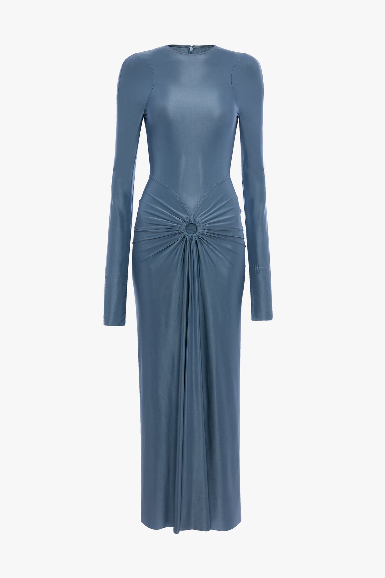 The body-sculpting stretch jersey of the Frances Midi Dress creates a figure-flattering silhouette. A circular gathered detail at the waist adds texture and visual interest, while long sleeves with split cuffs add a discreet design detail.