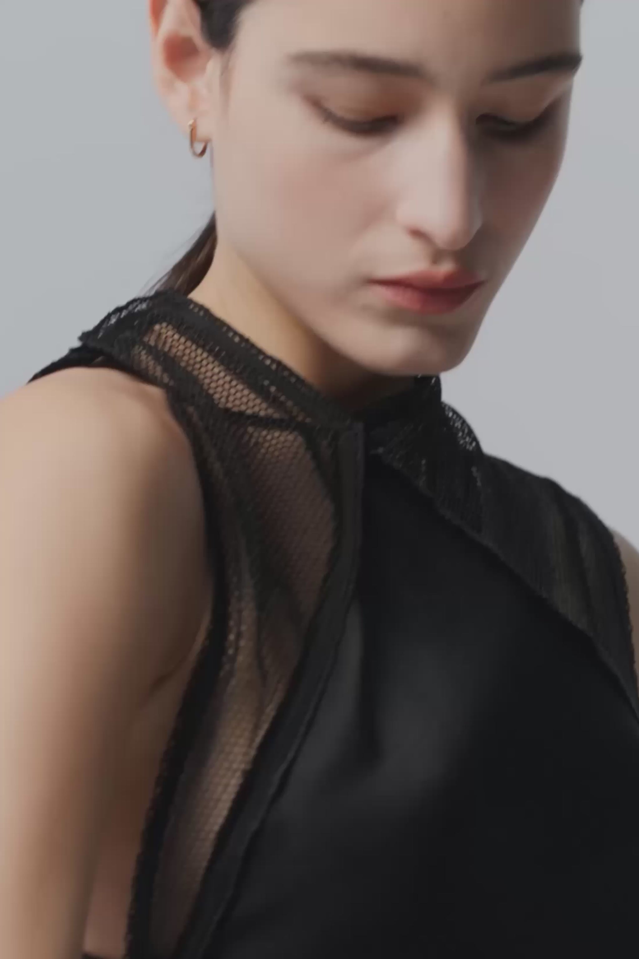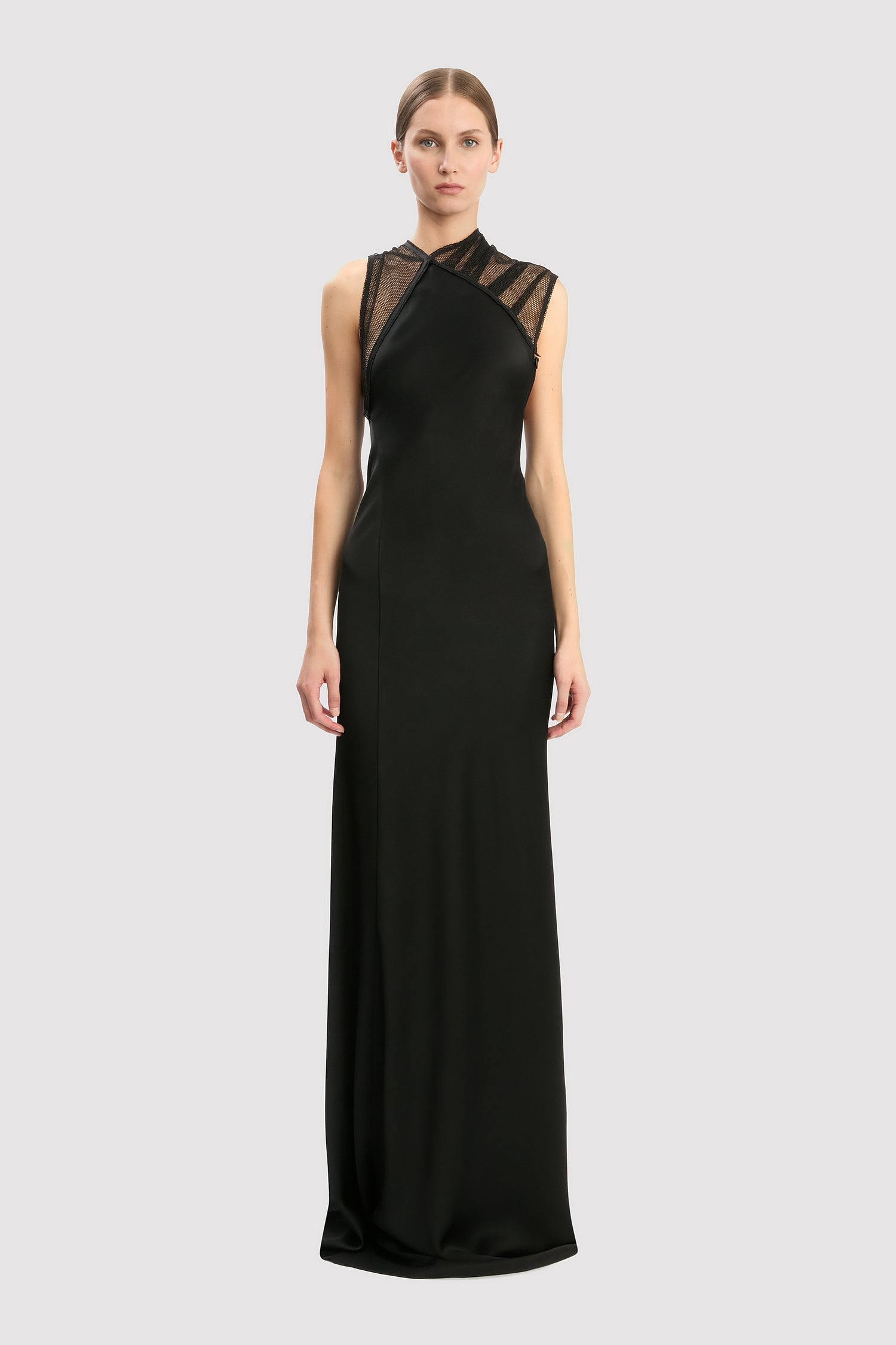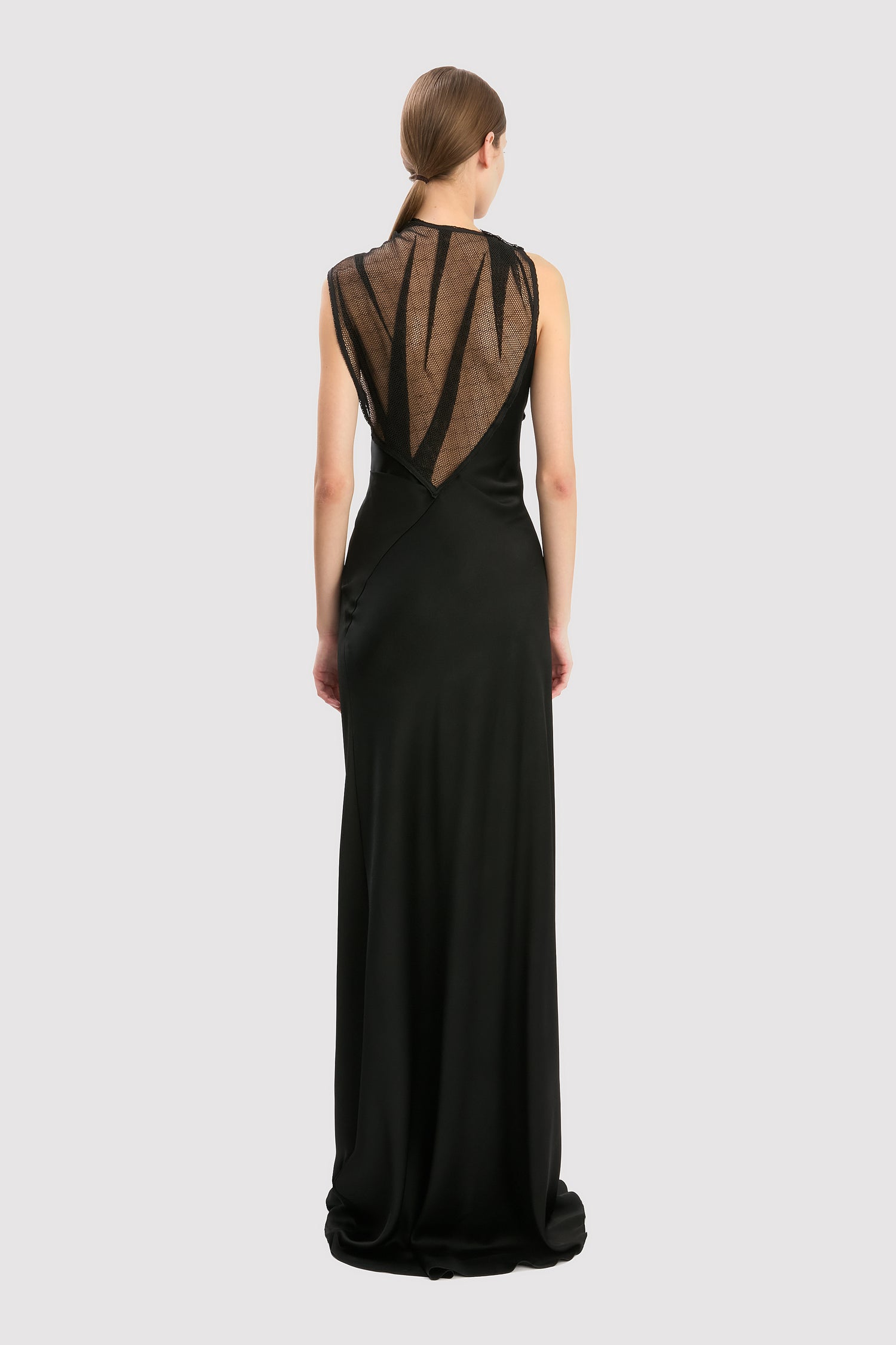 A mesh detail on the upper bodice and deep V neckline at the back give this gown its distinctive flavour. Crafted from crepe back satin with a bias cut, it is fitted above the waistline with a fluid cut below. Pleat and dart details at the bodice add a sensuous tactility, while binding at the neckline and armholes adds an elevated finishing touch.