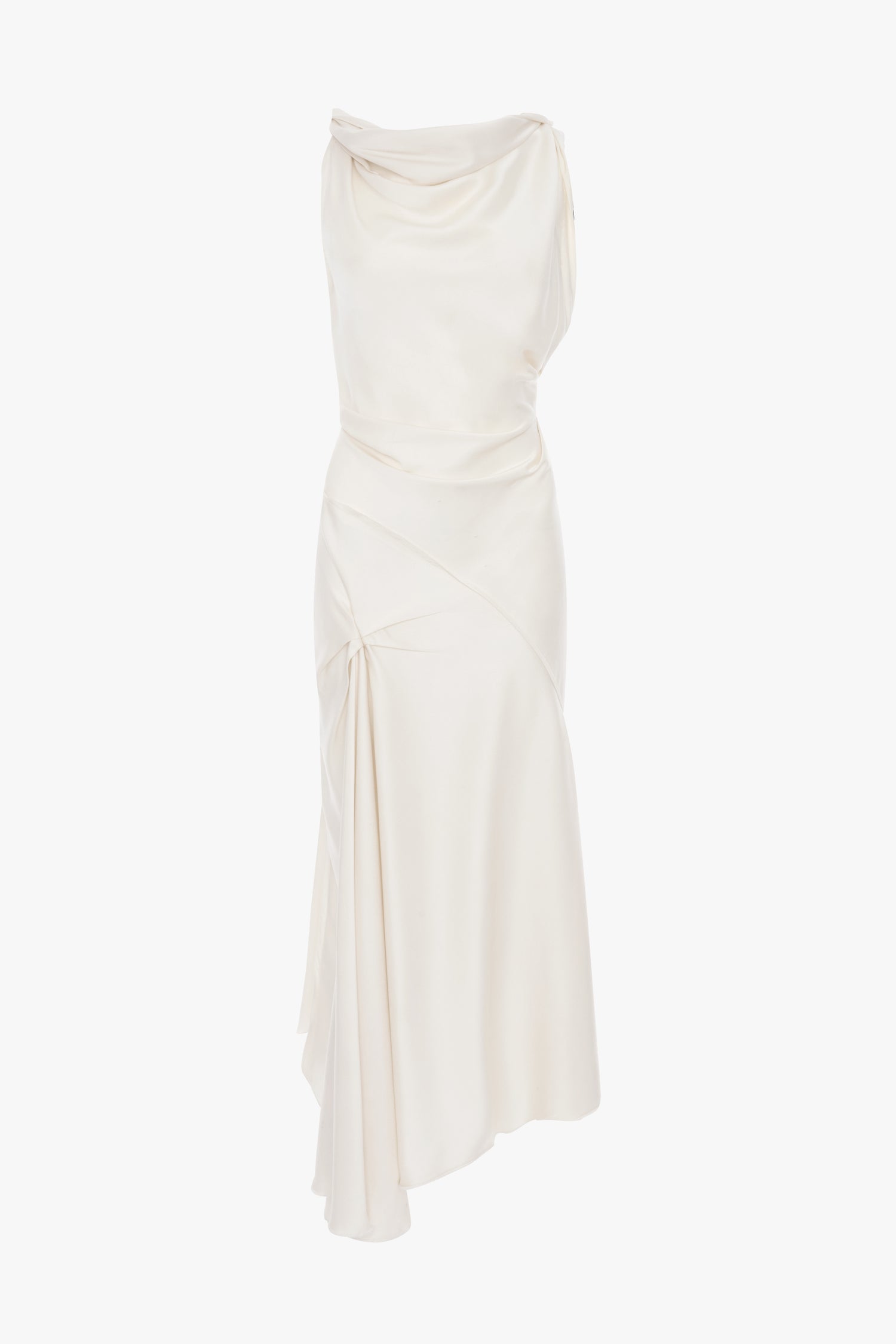 Beautifully draped to flatter the body, the Posy Midi Dress has an elegant asymmetric hemline and neckline. Tactile pleating at the waist and a V-shape back bring a sensual undertone. Presented in nostalgic Ivory, it is a polished but provocative piece of ready-to-wear.