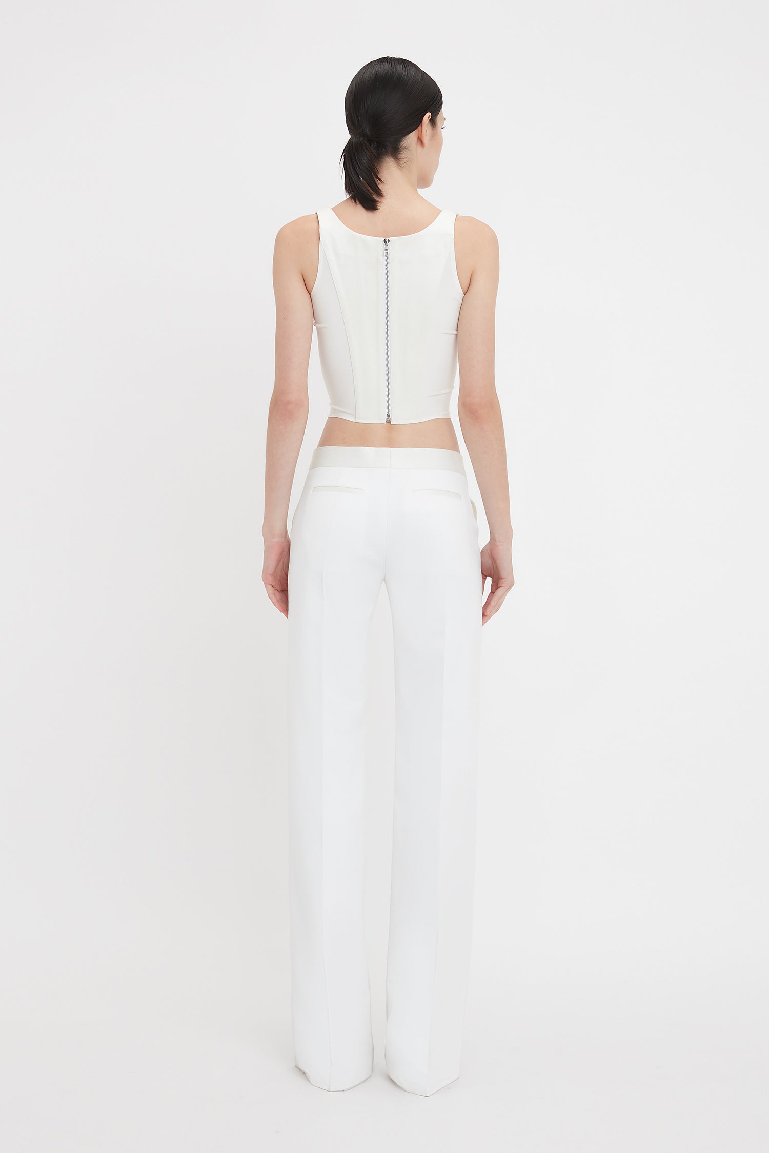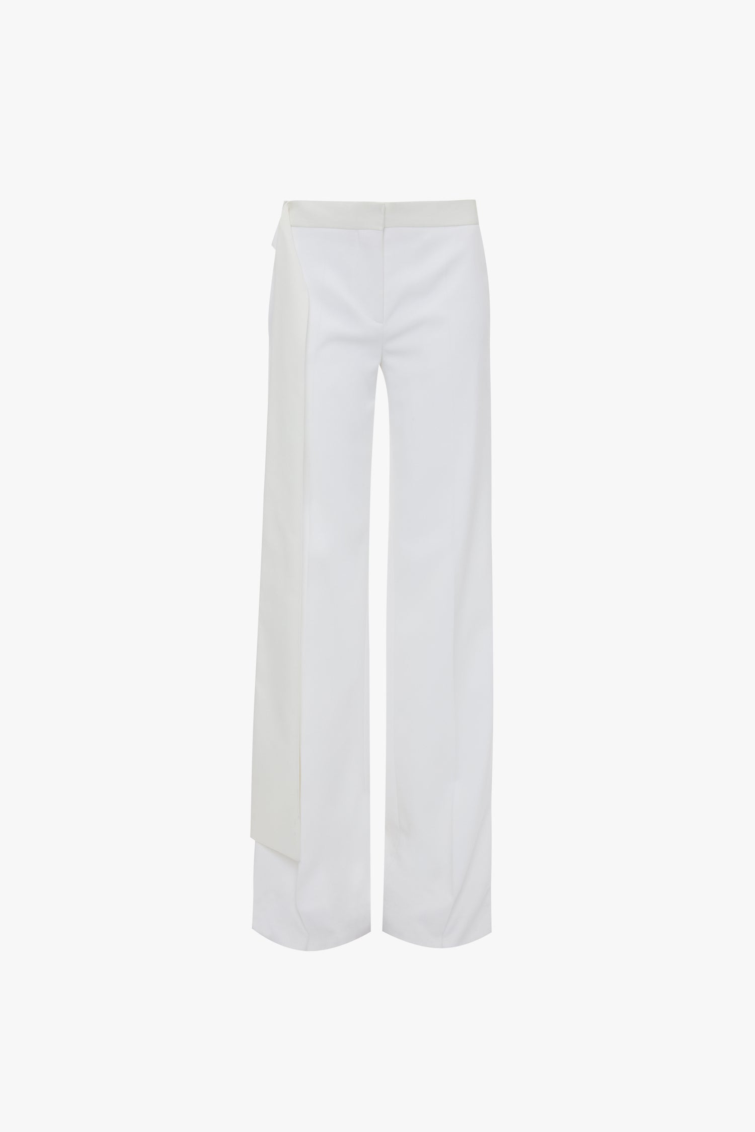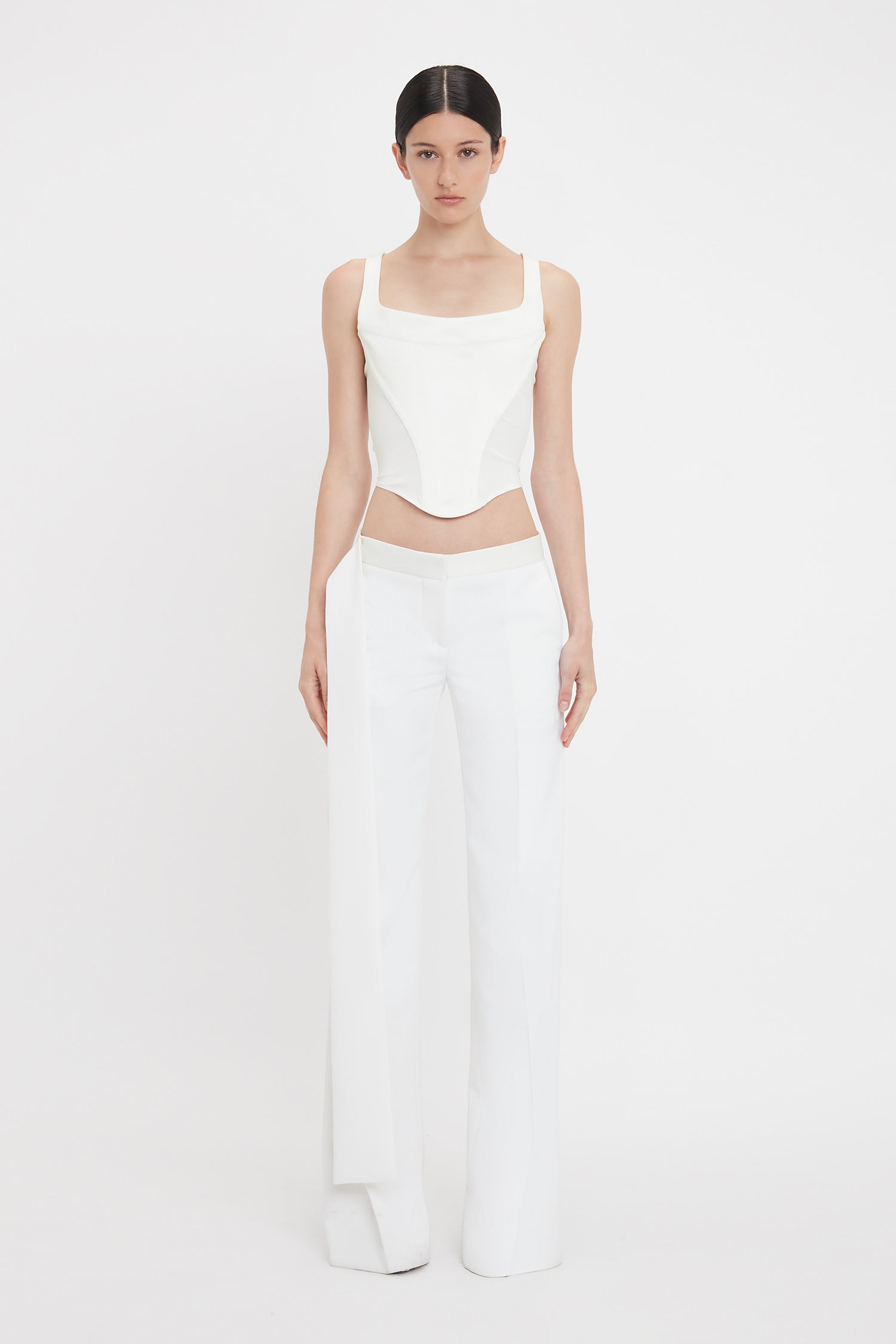 New for SS25, the Satin Waistband Trouser In Ivory is a personal pick of Victoria’s. Resonant of traditional tuxedo style, it has a contrasting satin waistband, slanted front pockets and back pockets with satin welts. An elegant satin tie that falls flamboyantly to midi length adds a feminine point of difference and references the house’s passion for elevated detailing.