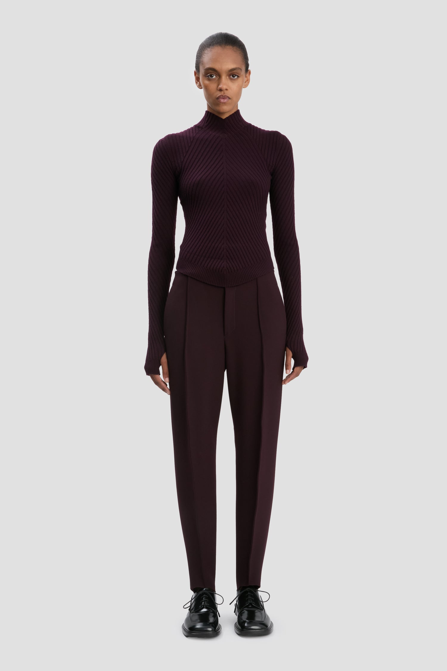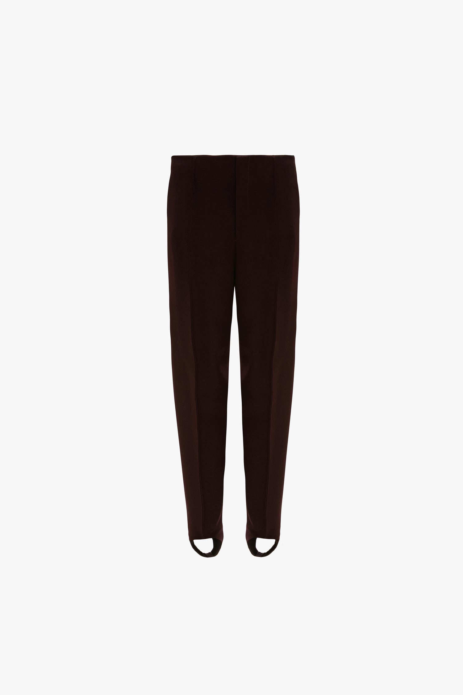 Elevating athleisure wear design codes, the Sculptural Trouser in Deep Mahogany is a formal trouser with equestrian stirrup detail, offering a contemporary twist on traditional tailoring. Adjustable to allow for different leg lengths, the stirrup is elasticated for absolute comfort. A double wool crepe fabrication and front and back darts give the trouser its streamlined cut, which is enhanced by slick side seam pockets.