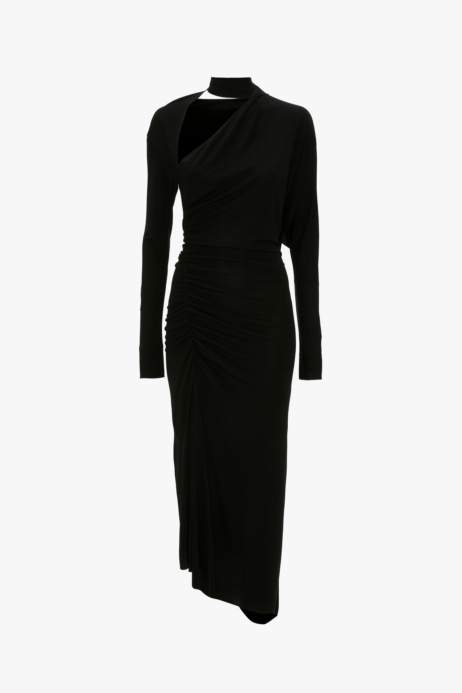 Subtle but provocative detailing elevates this body-sculpting black gown. A twist detail at the bust and cut-out above the left breast add a subtle sexiness, while an asymmetric cut-out and sash tie at the back provide a modern punctuation. The body-hugging stretch fabric is gathered at the back waistline for a textured, tactile finish.