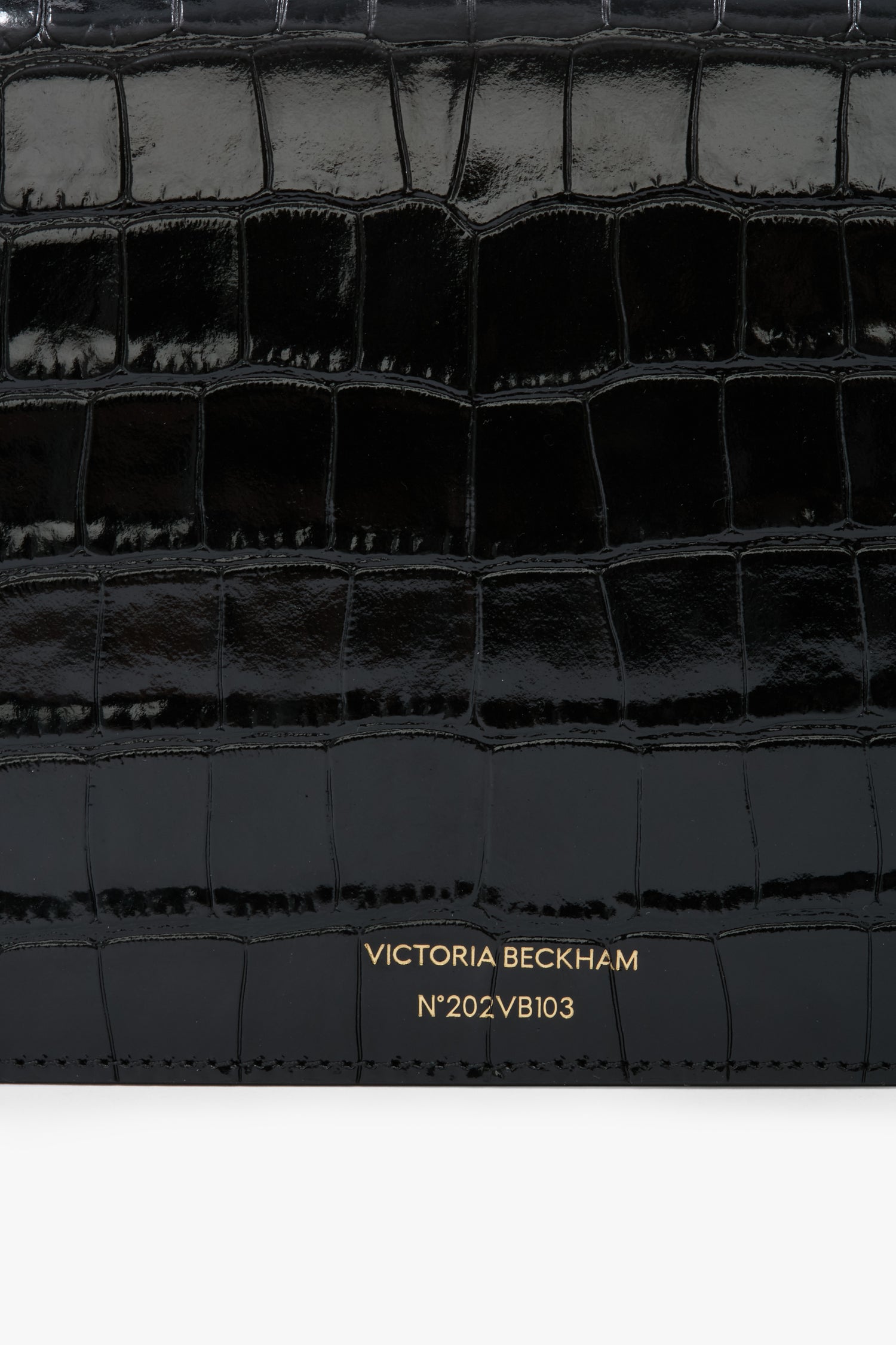 New to the Victoria Beckham leather goods edit, the Dorian Pochette is a polished evening wear handbag with a structured top handle and a removable strap. Made in Italy from croc-embossed calf leather and microsuede lining, it has the house’s signature B Frame, split-lock hardware and an internal double compartment with flat pocket. Presented in classic Black, it has an understated elegance.