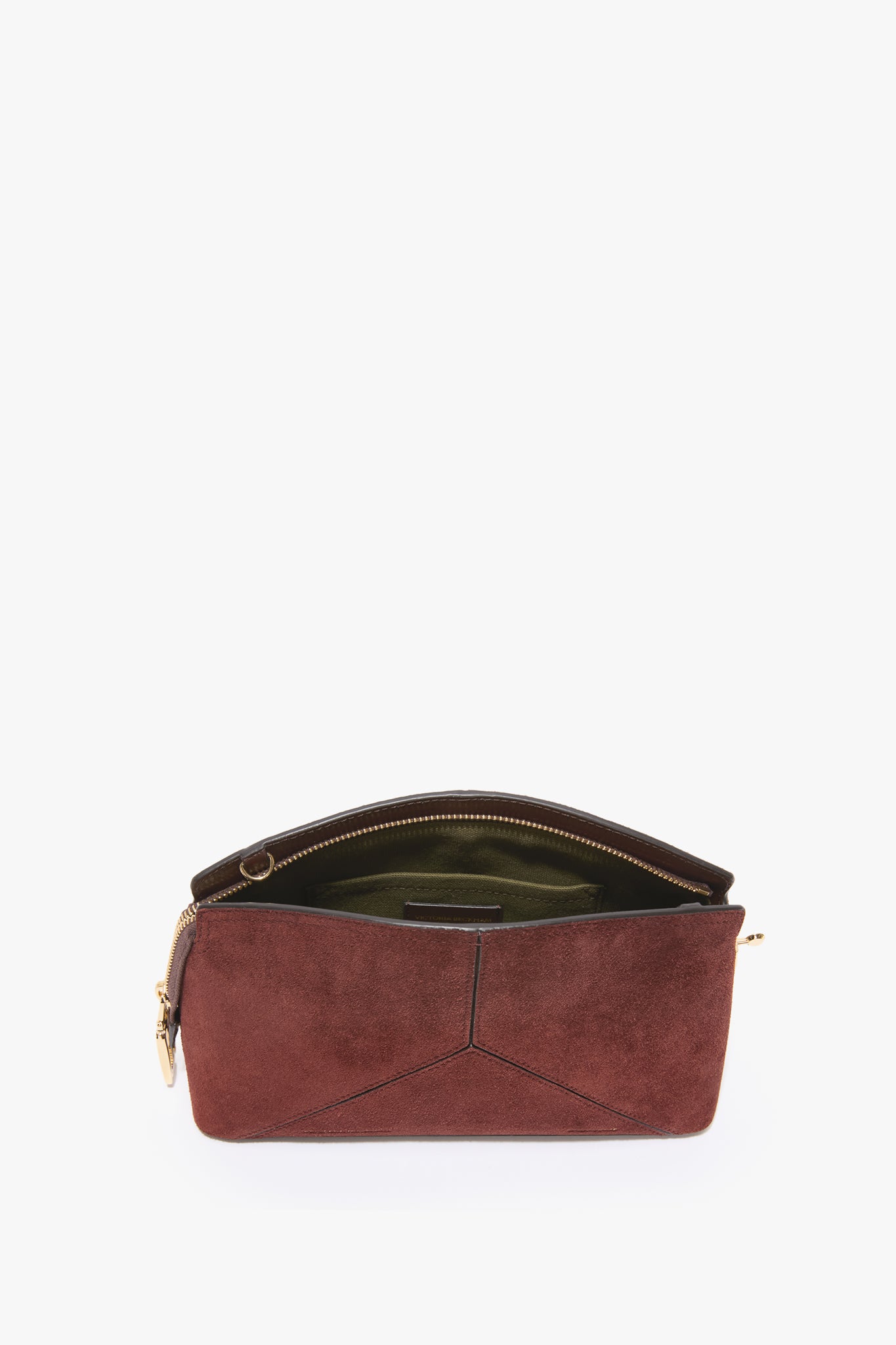 Presented in Dark Brown suede for the new season, the Victoria Crossbody Bag has a structured silhouette with an elegant curved top that marries masculine and feminine references beautifully. A favourite of Victoria’s, it has an adjustable and removable strap for versatile styling, B zip puller with turnlock closure and internal flat pocket for secure storage. Leather panels stitched to form the house’s signature V shape add a discreet but decorative finishing touch.
