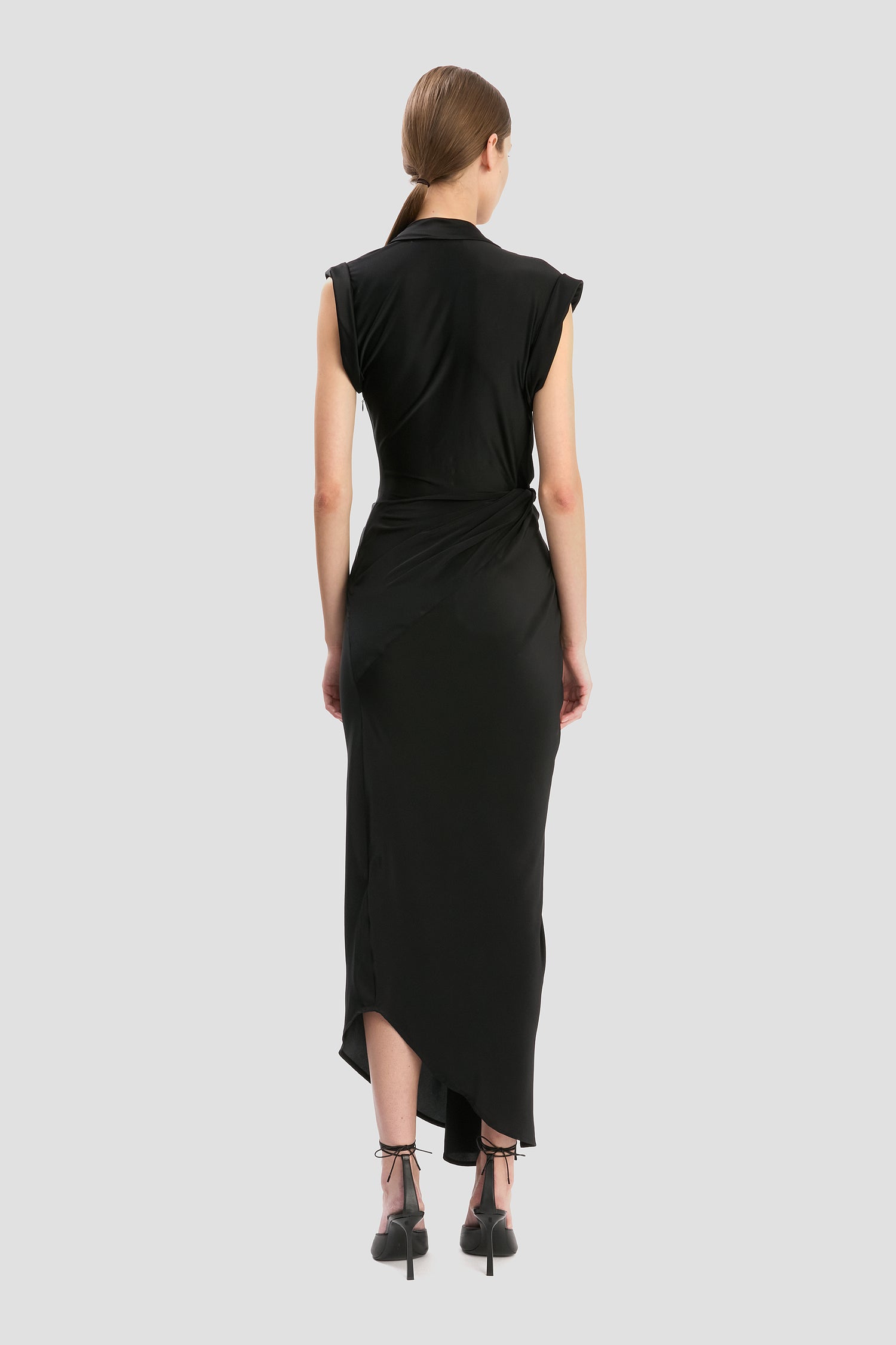 A reimagining of the classic little black dress, the Twist Detail Dress has a wrap-front neckline with button closure, front skirt split and directional asymmetric hemline. Tactile talking points, including a short sleeve with rolled hemline, twisted drape neckline and high-shine bodice, bring a subtle sensuality to this polished but provocative midi dress.