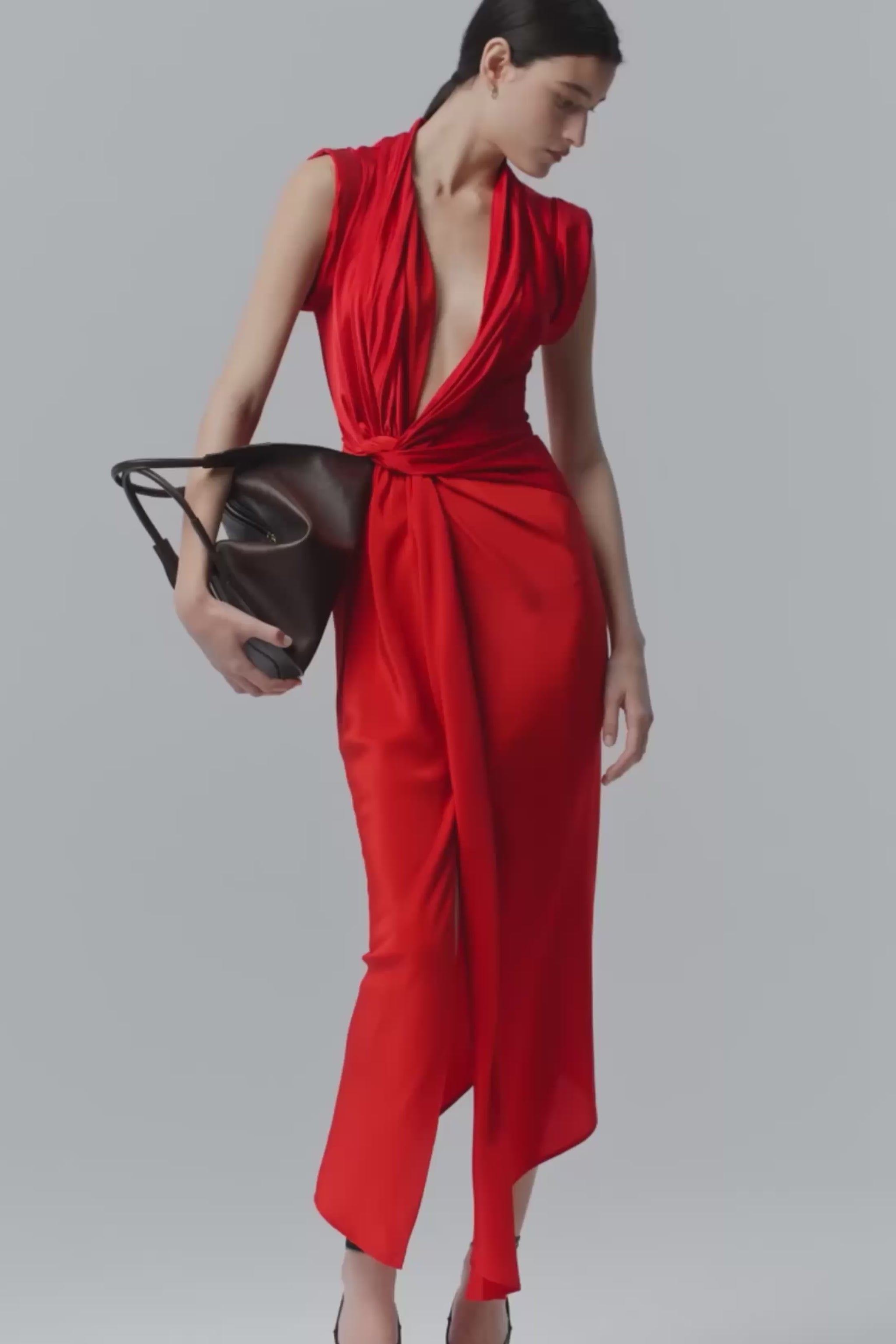 Tactile talking points, including a short sleeve with rolled hem, twisted drape neckline and high-shine bodice, bring a subtle sensuality to the Twist Dress. Presented in confident Cardinal Red, it has a wrap-front neckline with button closure, front skirt split and directional asymmetric hemline.