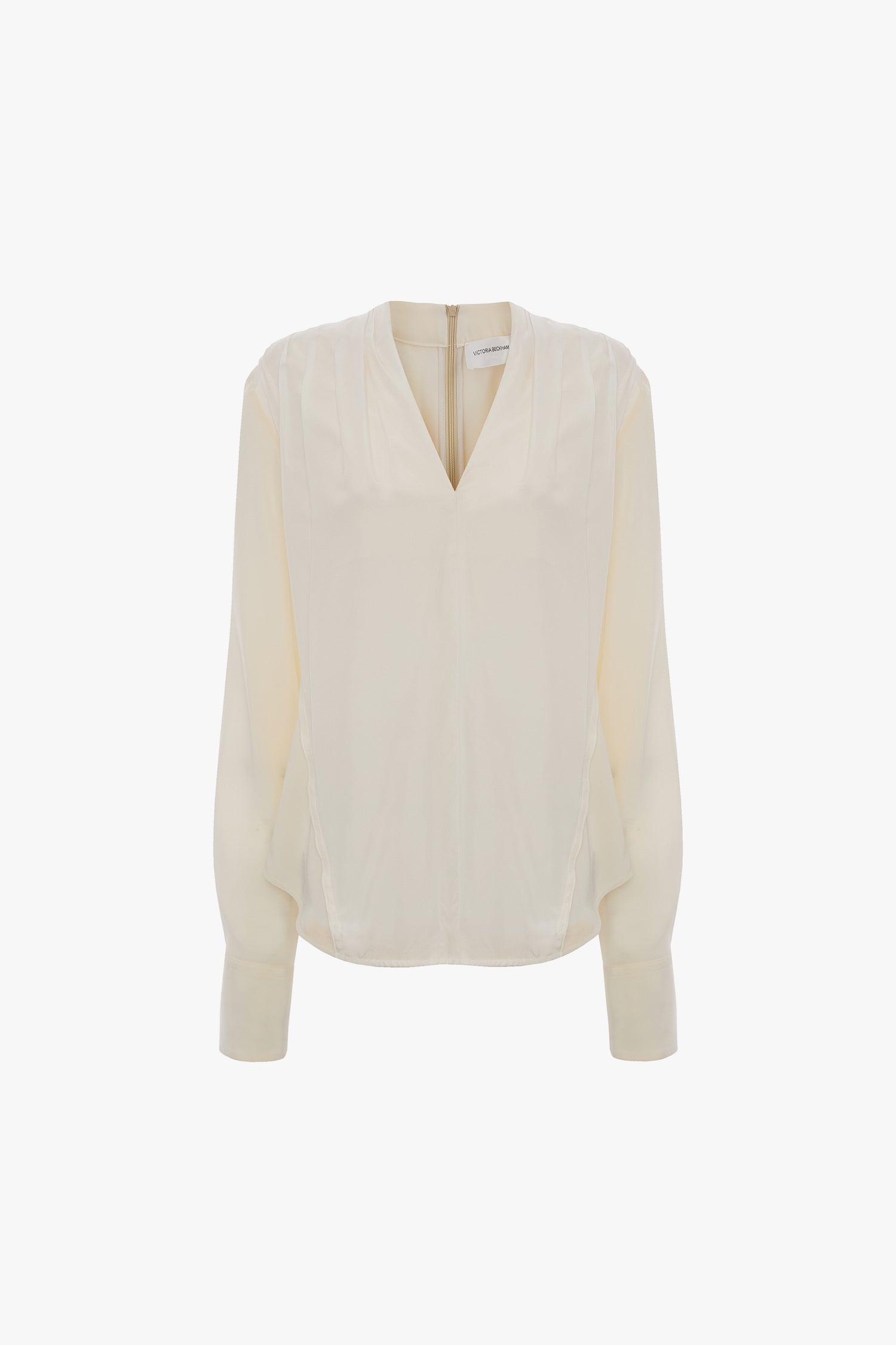 Tailored in a heavyweight crepe de chine, the V-Neck Gathered Top in Ivory embodies the house’s signature subtle sophistication. Long sleeves with distinctive overlong cuffs add a contemporary perspective, while a traditional V neckline is elevated with gathered detailing. Exposed side seams add a tactile point of difference.