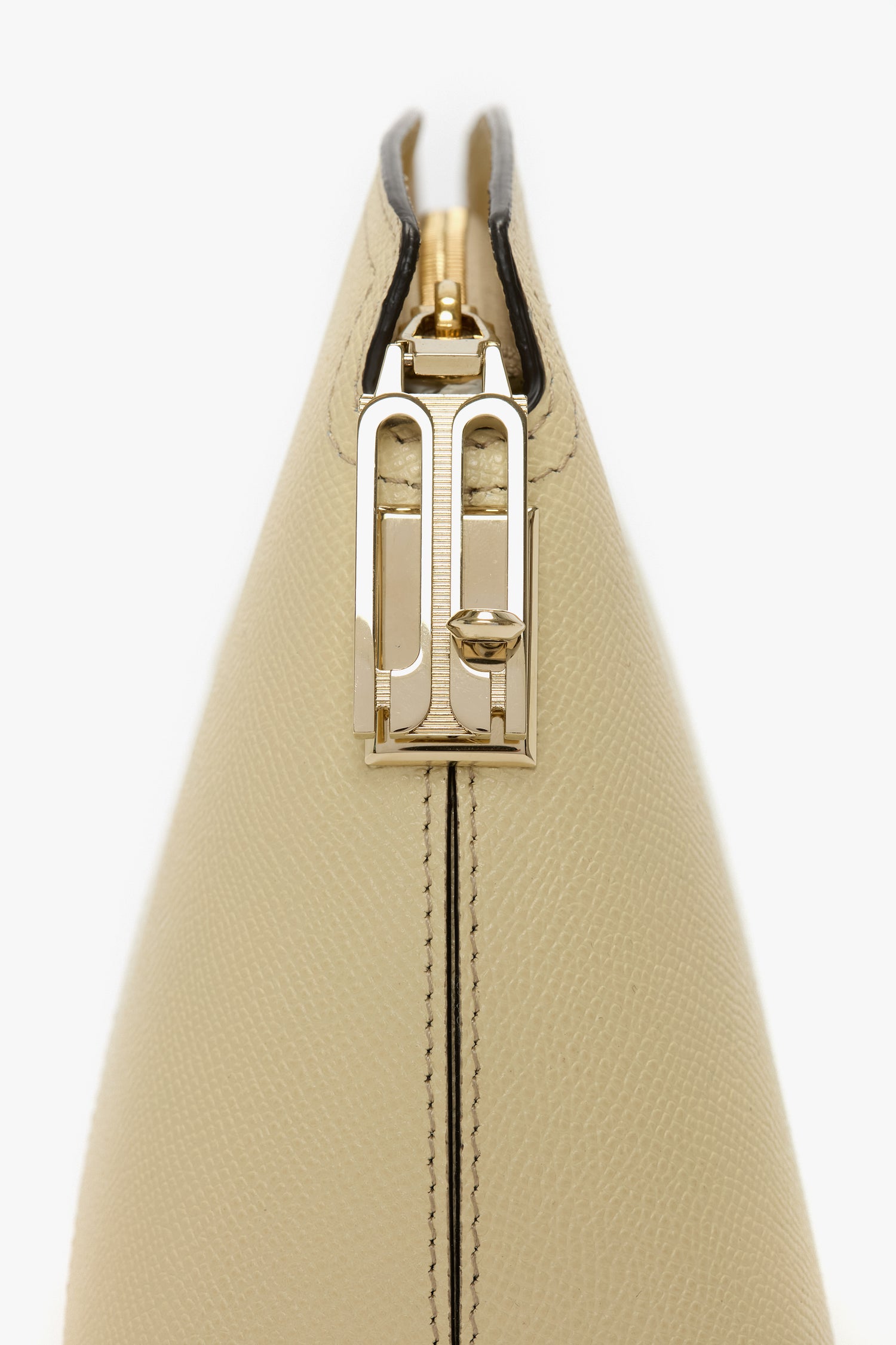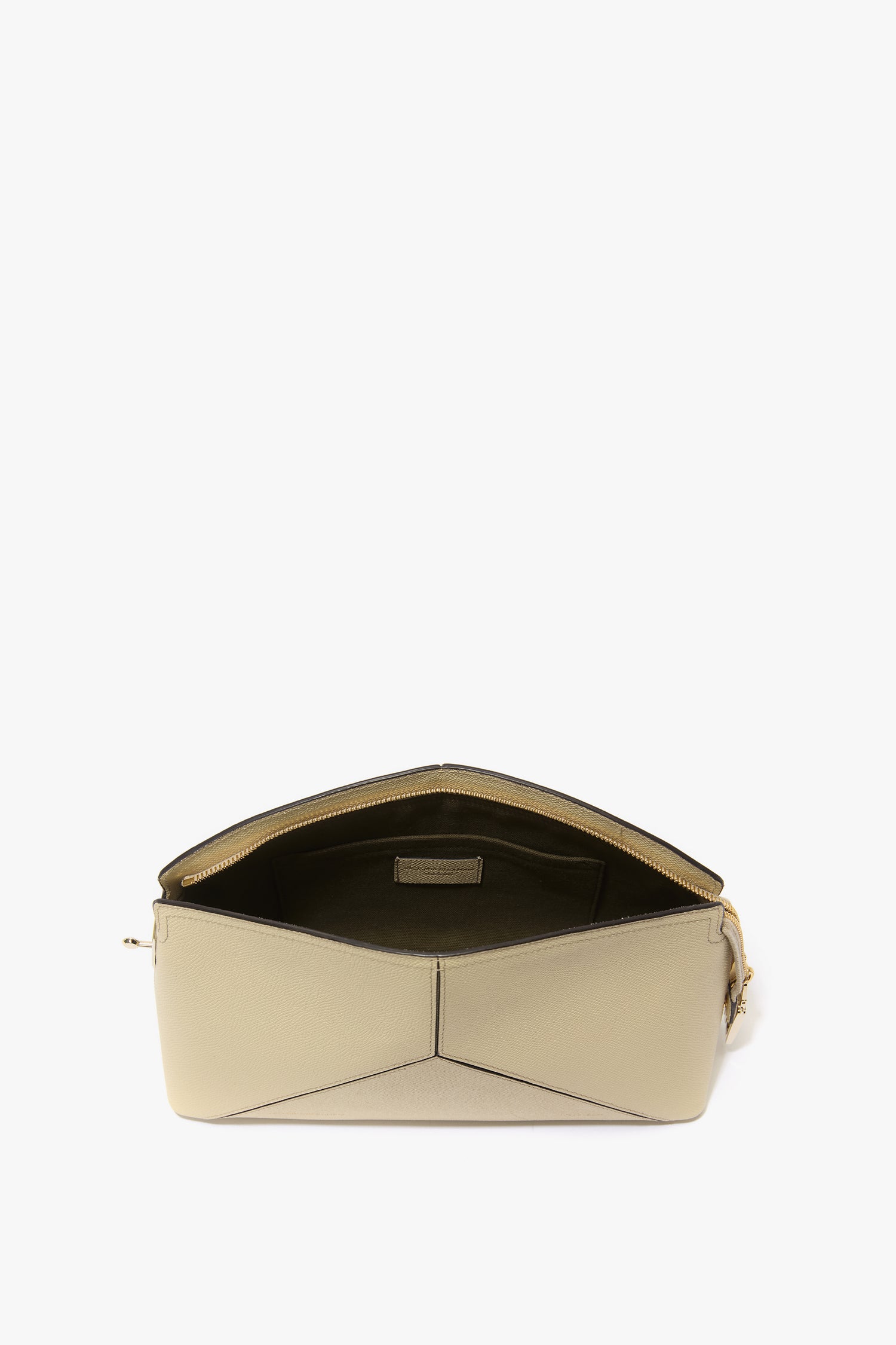 This textured calf leather Victoria Clutch is a favourite of Victoria’s. Presented in Ivory, it has a sleek silhouette with structured body and softly rounded top for a contemporary blend of masculine and feminine. Design features include an engraved B zip puller and padlock closure, snap button to hold the zip tape in place, textile lining and a flat internal pocket. The house’s signature design feature of leather panels stitched to form a V shape adds visual interest, while the discretely stamped address of Victoria’s London studio (N.202) followed by a unique serial number elevates the look further.