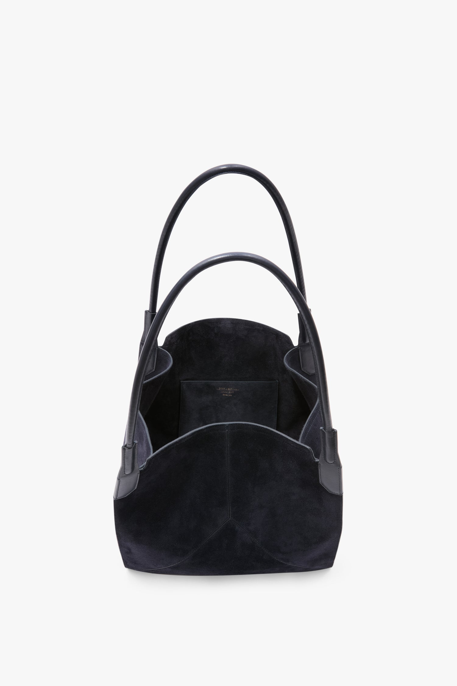 Tactile suede brings a velvet-soft finish to the Victoria Tote Bag. Presented in versatile Navy, it has an unstructured silhouette for a relaxed look. Simple lines and the absence of traditional hardware create a minimal aesthetic punctuated only by subtle V stitching on the front panels. Tonal suede lining and an internal flat pocket are polished and practical finishing touches.