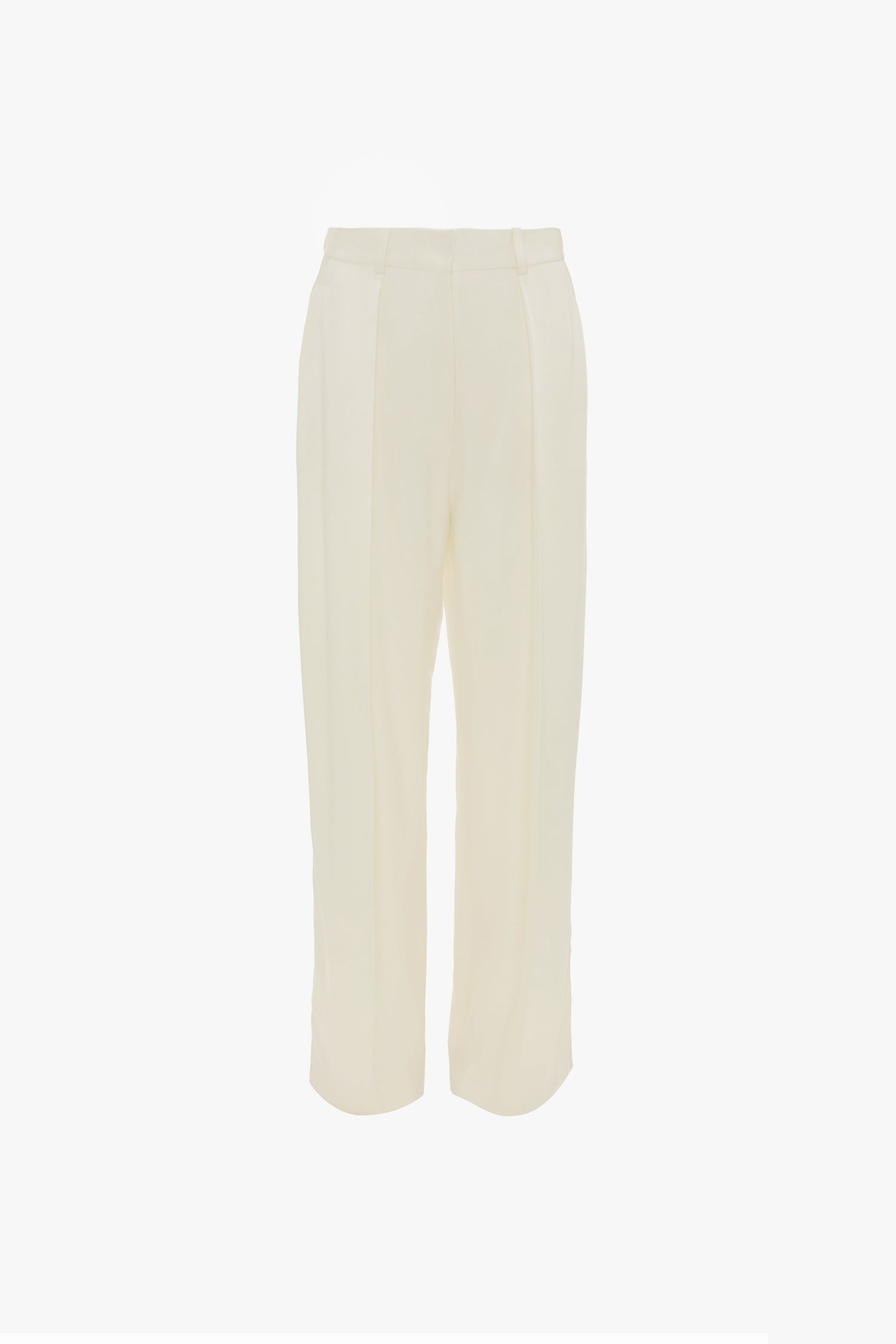 Meticulously tailored from crepe back satin and presented in a nostalgic shade of Ivory, the Wide Leg Trouser offers a distinctly feminine perspective on formal tailoring. With a high-rise waist, wide leg and structured pleats along the trouser legs, it has a beautifully proportioned silhouette. Side seam pockets, back jet pockets and belt loops add discrete design details, while flat piping on the outside legs reflect the house’s assiduous attention to detail.