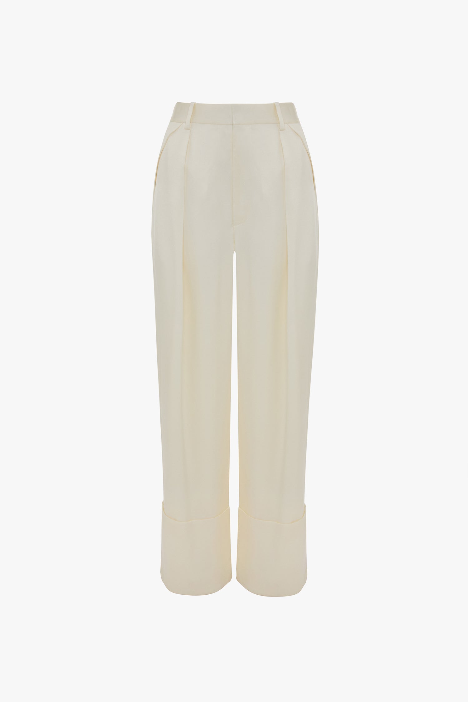 A refined take on classic tailoring, the Tailored Trousers in Ivory are crafted from fluid satin crepe for a polished yet effortless feel. Designed with a flattering high-rise waist, they fall into a wide-leg silhouette, accentuated by front pleats and deep turn-up hems for a sense of modern structure.