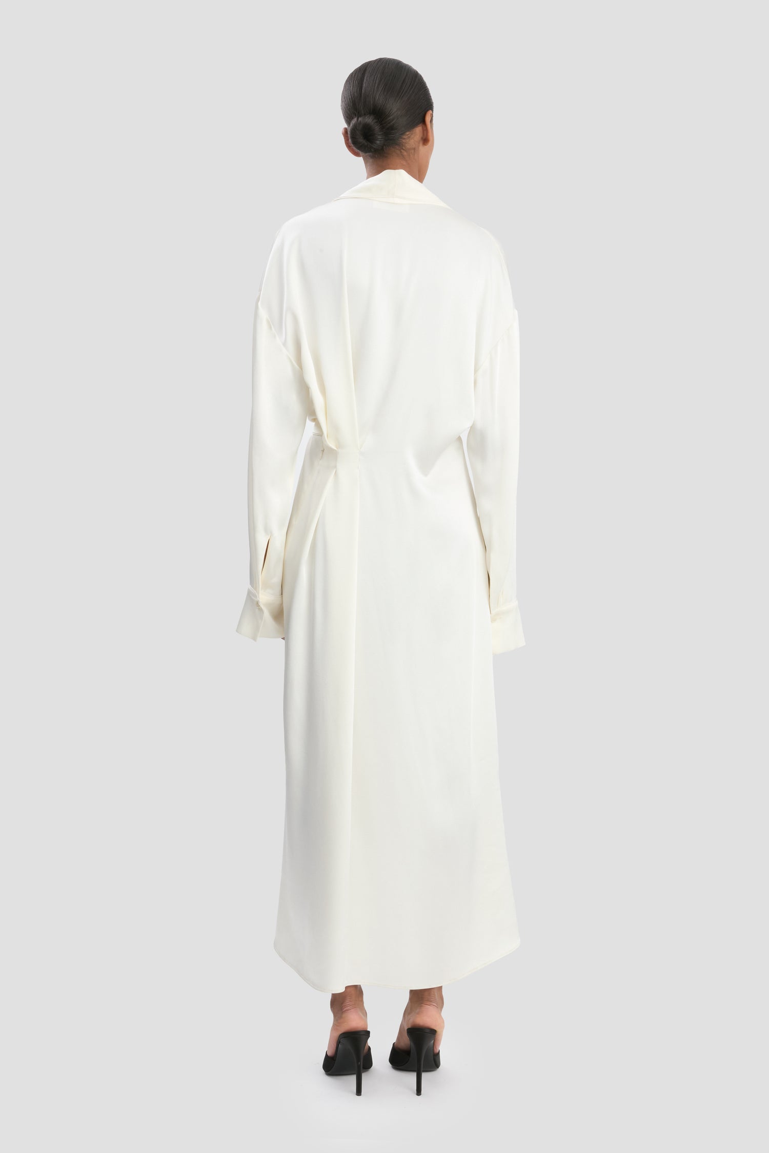 The classic wrap dress is imbued with a cool sophistication in the Wrap Detail Midi Dress. Crafted from crepe back satin for an effortless drape, it has a distinctive shawl collar neckline, dropped shoulders and longer-length sleeves. Designed for a relaxed, boyish fit, it has a feminine sensibility evoked by a waist belt with decorative piping, a front split in the skirt, pleat detail at the back of the waist and a romantic shade of Ivory.