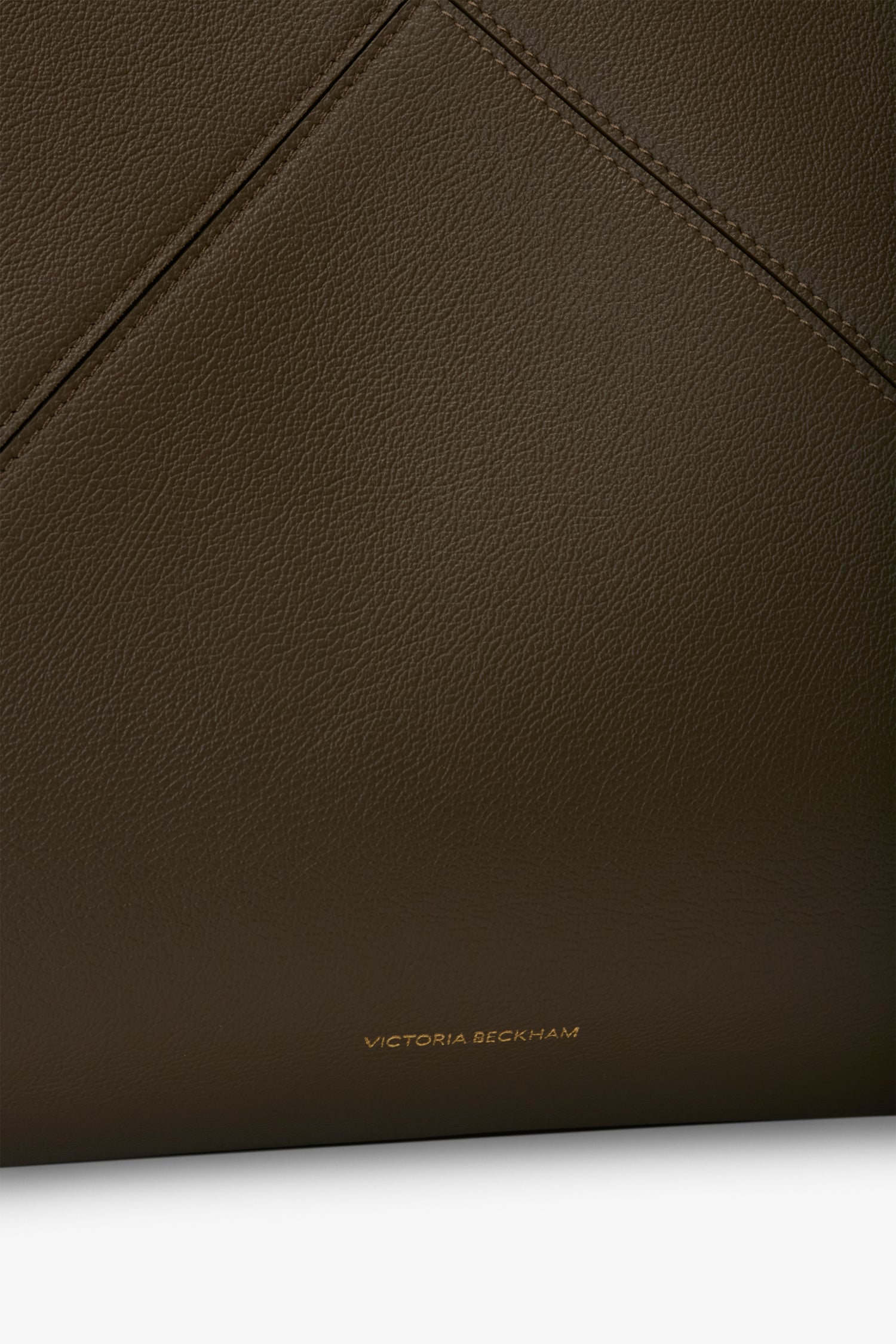 Part of the Victoria family of leather goods, the Victoria Travel Tote Bag is defined by its simple lines and minimal aesthetic. Discreet V-stitched panels and gold hardware, including a Victoria Beckham logo and unique serial number, are the only decoration. The tactile soft grained leather adds depth and interest to the silhouette, while the utilitarian shade of Khaki adds a contemporary talking point. Canvas lining and an internal concealed pocket with zipper complete the look.